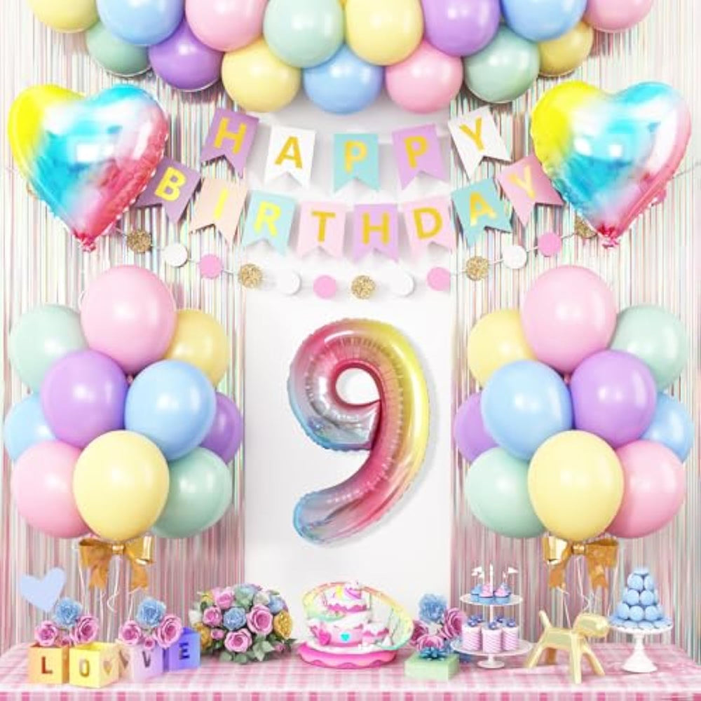 | 9Th Birthday Decorations:You Will Receive 25Pcs Latex Pastel Rainbow Balloons (Purple Balloons,Blue Balloons, Yellow Balloons,Green Balloons,Pink Balloons),Gradient Number 9 Foil Balloon,1Pcs Happy Birthday Banner,1Pcs Iridescent Fringe Curtain Background (2 Meters),1 Paper Dot Garland,2Pcs Foil Heart,Glue,Ribbon. | | Premium Materials:The Paper Dot Garland And The Pastel Happy Birthday Banner Are Made Of Paper Material.The Pastel 9Th Birthday Balloons Are Made Of High Quality Latex,Strong,Non Toxic And Reusable.Suitable For Boy Girls Kids Baby 9Th Birthday Themed Decor. | | Effortless Diy Party Decorations:The Rainbow 9Th Birthday Decorations Are Easy To Set Up. Whether It'S For Yourself, Your Kids, Or Your Friends, You'Ll Enjoy The Diy Fun Of Creating The Perfect Celebration Using The Included Tools (Strip, Ribbon, Glue). A Little Effort Goes A Long Way For A Memorable Birthday Experience. | | Wide Application: Suitable For Your Baby Girls Baby Boys Kids 9Th Birthday Party, We Can Choose This Kit For Them To Celebrate Their Birthday, No Matter From The Colors Or The Rainbow Elements, They Are Super Fit For Your Kids Pastel Rainbow Themed Baby Shower For Having A Pretty Great Time. | |