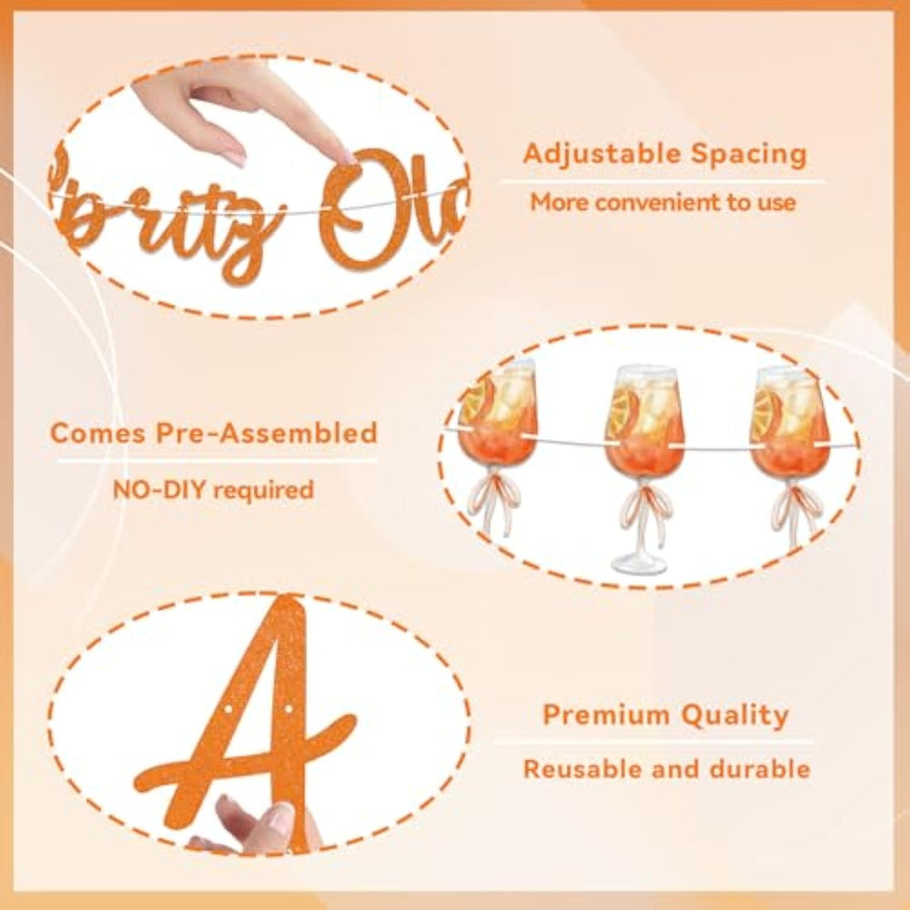 | Material: Eco-Friendly Paper, Surface-Attached Glitter, Perfect For A Aperol Cocktail Birthday/Bachelorette/Bridal Shower Party. | | This Orange Glitter A Spritz Older Bunting Decorations, Aperol Spritz Bridal Shower Party Supplies, A Big Hit For Your Party. | | This Banner Is So Suitable For Aperol Spritz Birthday Party, Bachelorette Decorations, Photo Studio, Etc. Perfect For Your Aperol Cocktail Birthday Shower Party Decorations. | | Pre-Strung: The Glitter A Spritz Older Banner You Receive Is Already Strung On A 6-Foot String, So All You Have To Do Is Hang It Up And Get Your Party Started! | | Unique Design: Meticulously Hand Designed, We Made Sure Our Gold Glitter A Spritz Older Banners Were Super Premium And One-Of-A-Kind. Perfect For Your Aperol Spritz Birthday Party And Will Set Your Bridal Shower Celebration Apart Too! | |