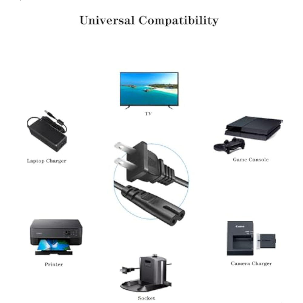 Widely Compatible: Works With Most Brands And A Wide Variety Of Electronic Devices Including Led Lcd Smart Tv, Monitor, Printer, Laptop Notebook Charger, Camera Battery Charger, Charging Dock, Game Console, Ps5, Ps4 Slim, Xbox One-S X Console, Speaker, Sound Bar, Music System, Mini Fridge, And More Products. | | Perfect Length: 6 Feet Is The Perfect Length That Is Neither Too Long Nor Too Short To Provide Perfect Power To Your Monitor And Other Small Devices. | | Universal Design:Replace Lost Or Worn Out Power Cords, Say Goodbye To Your Cluttered Power Cords, Universal Design With 2-Pin Power Connection For Your Smart Tv Printer Or Other Devices. | | High Quality Material:Pure Copper Wire Core, Low Resistance, Strong Current Load And Good Conductivity. High Quality Pvc Material, The Wire Is Tough And Soft, Giving You A Comfortable Experience. | | Safety Protection: Rigorous Testing (Ul Listed). Bend Resistant, Heat Resistant, Flame Retardant, Giving You Full Electrical Safety Protec.