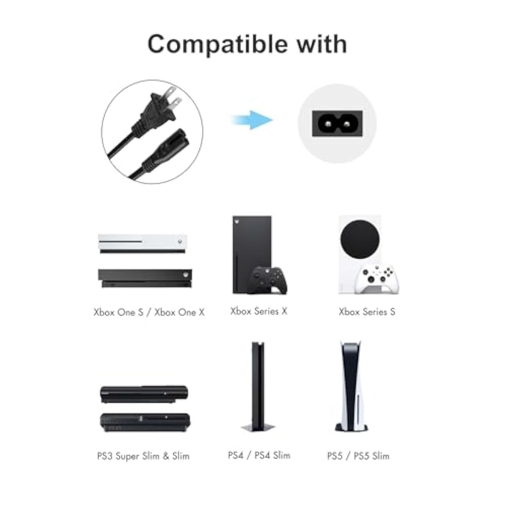 | ?Compatible With?Sony Ps5 / Ps5 Slim / Ps5 Pro / Ps4 / Ps4 Slim / Ps3 Slim/ Ps3 Super Slim ; Microsoft Xbox One S, Xbox One X, Xbox Series X, Xbox Series S | | ?Wide Compatibility?Fits Game Console, Tv, Printer, Sound Bar, Speaker System, Irobot Roomba And Other Devices Requiring 2 Slot Power Cord | | ?Ul Listed/ Safety?This Power Cord Are Tested, Approved And Certified By Ul To Ensure Safety For You And Your Connected Devices | | ?Power Cord Type?Non Polarized 2 Prong Figure 8 Power Cord ( Iec320 C7 To Nema 1-15P ), 18 Awg, 125V 7A | | ?Power Cord Length?6 Feet | | ?Friendly