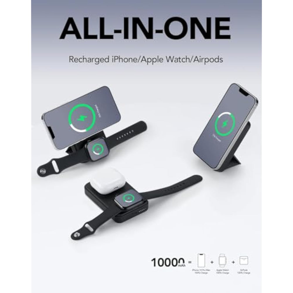 | 10000Mah Battery Capacity - The Power Bank Capacity Is 10000Mah, It Can Give 120% Additional Power To Iphone 12-13-14-15-16-17 Pro Max Or 14-15-16 Plus, 160% Additional Power To Iphone 12-13-14-15 Or 12-13-14-15 Pro, 200% Additional Power To Iphone 12-13 Mini. | | One For All - The All-In-One Power Bank Is Designed To Quickly And Safely Wirelessly Charge Iphone, Apple Watch And Airpods. What’S More, It Has A 20W Usb-C Output Port For Charging Other Devices. | | Charging On-The-Go - Armed With Super-Strong Magnets, The Power Bank Can Be Perfectly Aligned And Firmly Attached To Your Iphone And Make A Safe, Reliable And Efficiency On-The-Go Wireless Charging. | | Smart Foldable Stand - Whether You Are Watching A Movie Or Having A Zoom Meeting, The Built-In Foldable Stand Makes You A More Comfortable Viewing. | | Pass-Through Charging - Need An Overnight Charge For All Your Apple Devices Just Plug A Charging Cable Into The Power Bank To Make It Work As A Dual Wireless Charger, Either Of Iphone/Apple Watch/Airpods Or Power Bank Itself Will Get Fully Charged Overnight. This Is Only One Charger That You Need To Carry For Your Apple Devices When You Are Traveling. | |