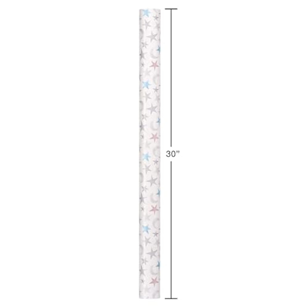 Includes 1 roll of reversible wrapping paper for baby showers | Jumbo roll measures 30 inches wide by 70 feet, 175 total square feet and can wrap approximately 42 shirt boxes that measure 14.75 inches x 9.5 inches x 1.88 inches. | This reversible jumbo wrapping paper features a neutral design of pastel stars and moon icons with a coordinating reversible side of gray watercolor stripes. Made in the USA with heavyweight, ecofriendly FSC approved paper. | Perfect gift wrap option baby showers, new babies, baby birthdays and any other celebration | American Greetings offers exceptional greeting cards, gift wrap and celebration products for birthdays, anniversaries, baby showers, bridal showers, weddings, holidays and more so you can connect in ways that fit your personality and