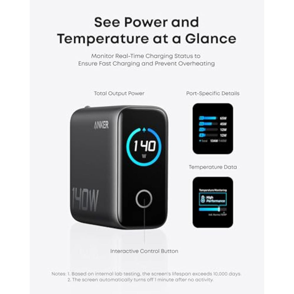 | Fast Charging for Four Devices: Enjoy the convenience of powering four devices simultaneously with our advanced GaN technology for optimal performance. | | Dual High-Speed USB-C Ports: Rapidly charge your 15-inch MacBook Air to 50% in just 30 minutes with either of the two USB-C ports, each offering a maximum output of 140W. | | Superior Safety: The advanced ActiveShield 2.0 system monitors device temperatures over 3 million times a day for enhanced safety. | | Monitor with Ease and Clarity: The high-definition color display provides a detailed view of the charging status, temperature, and port details, keeping you fully informed. | | What You Get: Anker Charger (140W, 4-Port, PD 3.1), 5 ft 240W USB-C to USB-C cable, user manual, 18-month , and our friendly