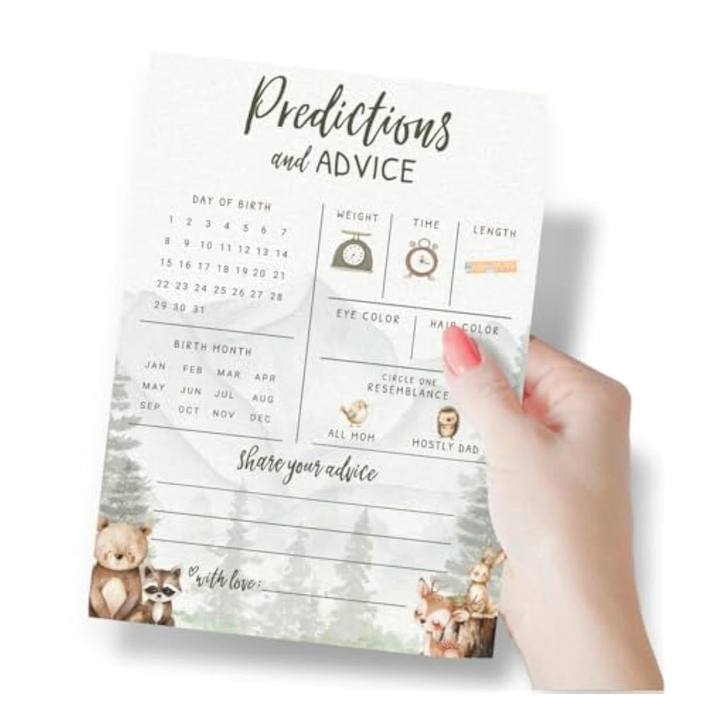 | Baby Shower Keepsake – Guests Can Share Well-Wishes, Heartfelt Advice, And Fun Baby Predictions, Creating A Treasured Keepsake For The Parents-To-Be | | Durable Easy To Write On – Printed On Thick, High-Quality Cardstock With A Smooth Surface, Allowing Guests To Write Clearly While Preventing Smudges | | Fun For All Ages – Guests Will Enjoy Predicting The Baby’S Birth Details In This Easy And Interactive Baby Shower Activity, Bringing A Touch Of Friendly Competition To The Party | | Woodland Adventure Theme – Adorable Forest Animal Artwork Featuring A Bear, Bunny, Deer, And Raccoon, Perfectly Complements Your Nature-Themed Baby Shower Décor | | Set Of 30 Cards – Each Pack Includes 30 Beautifully Designed Cards, Making Them Perfect For Both Large And Small Gatherings, Ensuring Every Guest Can Participate | |