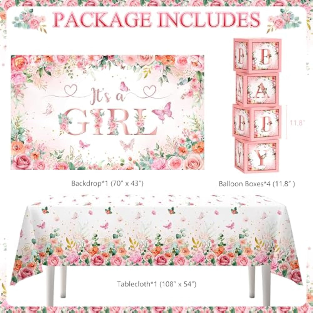 | Baby Shower Decorations For Girl -- You Will Get 1 It'S A Girl Backdrop, 1 Floral Tablecloth, 1 "Baby Girl"Foil Balloon, 1 Star-Shaped Foil Balloon, 1 Heart-Shaped Foil Balloon, 12 3D Butterfly Stickers, 4 Pink Baby Boxes With Letters, 85 Latex Balloons, 3 Tools Kit (Balloon Chain, Glue Points, Ribbon). | | Rose Gold Balloons Garland Arch Kit -- These Balloons Made Of Natural Latex And Quality Aluminum Film, Non-Toxic, Not Easy To Break And Air/Helium Supported. The Package Includes 3 Tools - Balloon Chain, Balloon Glue Points And Ribbon. These Tools Allow You To Effortlessly Create A Stunning Rose Gold Balloon Arch With Minimal Time And Effort. | | Pink Baby Box With Letters -- The Baby Blocks For Baby Shower Are Made Of Thick Cardboard, Eco-Friendly, Reusable And Foldable.The Baby Boxes Are Pre-Folded As Described In The Picture, You Can Assemble Them Easily. Letters Are Printed On The Box, No Need To Paste By Yourself! | | Floral Themed Design -- It'S A Girl Polyester Backdrop And Disposable Plastic Tablecloth Adopt Watercolor Style And Floral Theme Design, Mainly Feature Pink Color With Colorful Blooming Flowers, Butterflies, Green Leaves And Eye-Catching Lettering Pattern, Create A Unique Atmosphere For Your Baby Girl'S Birthday Party! | | Widely Applications -- The Baby Shower Party Set Is Perfect For Baby Girl Baby Shower, Floral Baby Shower, Rose Gold Birthday Party, Pink Theme Birthday Party, Girls' 1St Birthday Party, It'S A Girl Theme Party, Welcome Baby Party, Gender Reveal Party, Etc.. | |