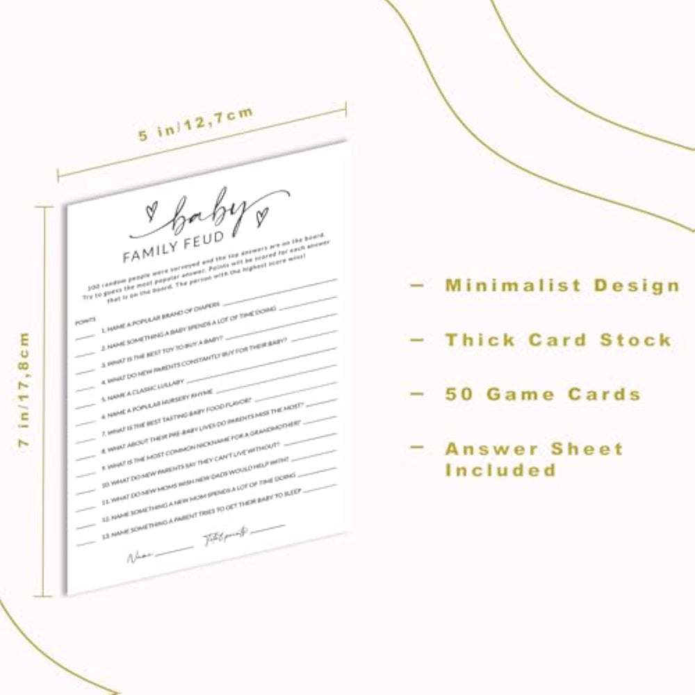 | Fun Baby Shower Game: Bring Laughter And Excitement To Your Baby Shower With 50 Family Feud-Style Game Cards Everyone Will Love. | | High-Quality Baby Shower Supplies: Extra-Thick, Durable 5X7 Inch Cards With A Premium, Minimalist Design That Fits Any Baby Shower Theme. | | Easy To Play, No Setup Needed: Simply Hand Out The Cards And Start The Fun β No Complicated Rules Or Preparation Required. | | Perfect For Boys, Girls, Or Gender Neutral Showers: Designed To Complement Any Baby Shower, Whether You Know The Gender Or Want To Keep It A Surprise. | | Great Baby Shower Activity Keepsake: Guests Will Enjoy Guessing Popular Baby-Related Answers, Creating Unforgettable Memories And Lasting Fun. | |