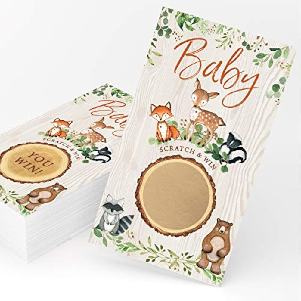 | Baby Shower Fun: Simple Scratch-To-Reveal Game That Adds Excitement For Guests Of All Ages | | Customizable: Scratch-Off Game Includes 3 Winner Cards And 27 Losing Cards With Peel-And-Stick Stickers To Match Your Guest Count And Prize Setup | | Premium Cardstock: Thick Durable Cards That Resist Tearing With A Smooth Easy-To-Scratch Sticker | | Woodland Creatures Theme: Forest Friends Design Featuring Cute Animals And Greenery Foliage, Perfectly Pairs With Woodland Baby Shower Décor | | 30 Cards Stickers: Ideal For Gatherings Large Or Small, Ensuring Every Guest Has A Chance To Participate | |