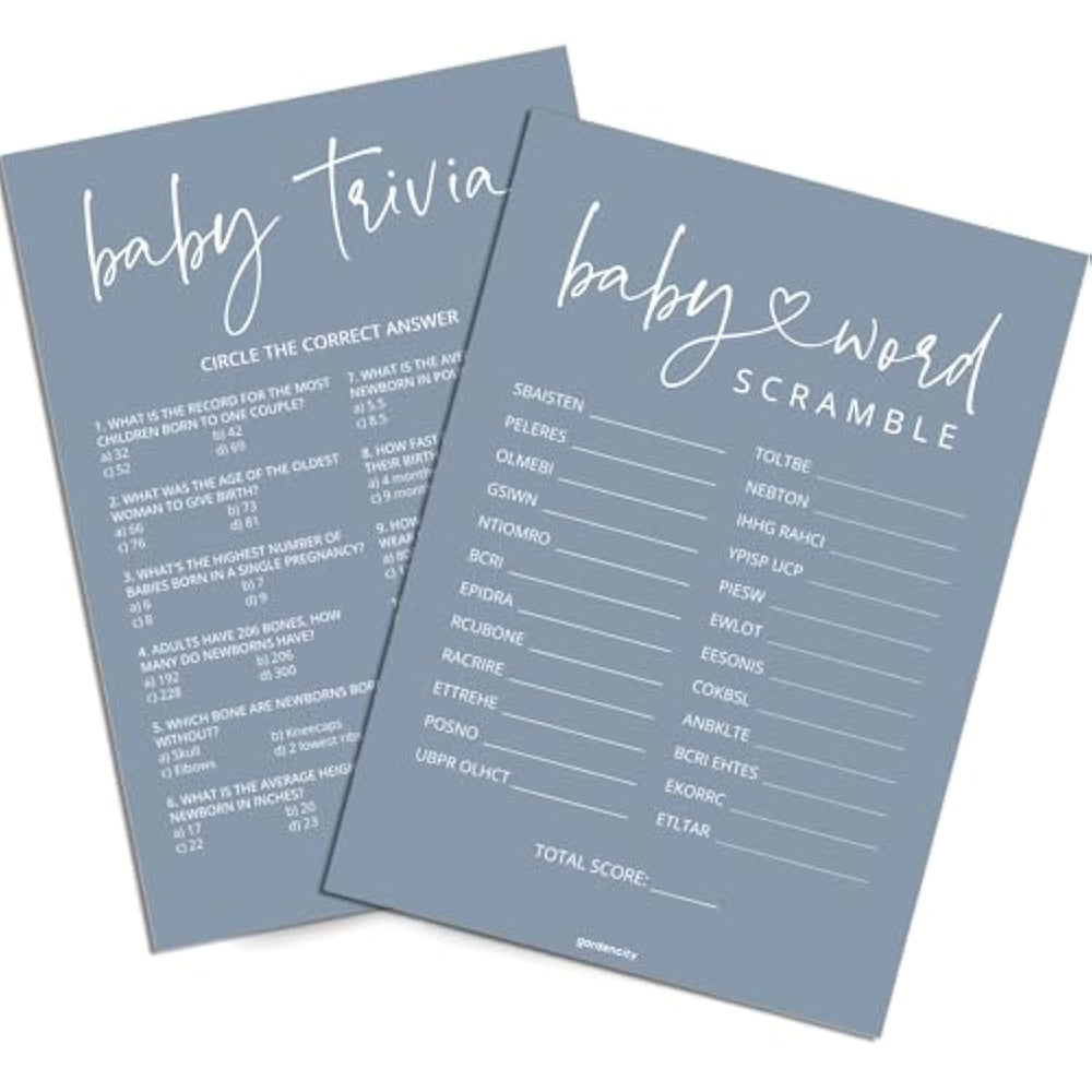 | Double The Fun: Includes Two Of The Most Popular Baby Shower Games On 50 Double-Sided Game Cards And An Answer Sheet With Instructions. Our Baby Trivia And Word Scramble Games Add Fun And Laughter To Any Baby Shower Event. | | Exceptional Quality: These Baby Shower Games Are Professionally Printed On Heavy-Duty Card Stock. In Contrast To Other Games That Use Thin Paper Sheets, The Feel Of Our Thick Game Cards Will Match The Quality Of Your Celebration. | | Perfect Size: Measuring 5X7 Inches, The Cards Fit Well On Table And Place Settings And Are Easy To Read. | | Ready To Play: No Additional Prep Needed! Our Baby Trivia Word Scramble Cards Come Ready To Use, Making Your Baby Shower Planning Effortless And Fun. | | Variations: Check Out Our Store For More Games And Ideas That Will Make Your Celebration One To Remember. | |