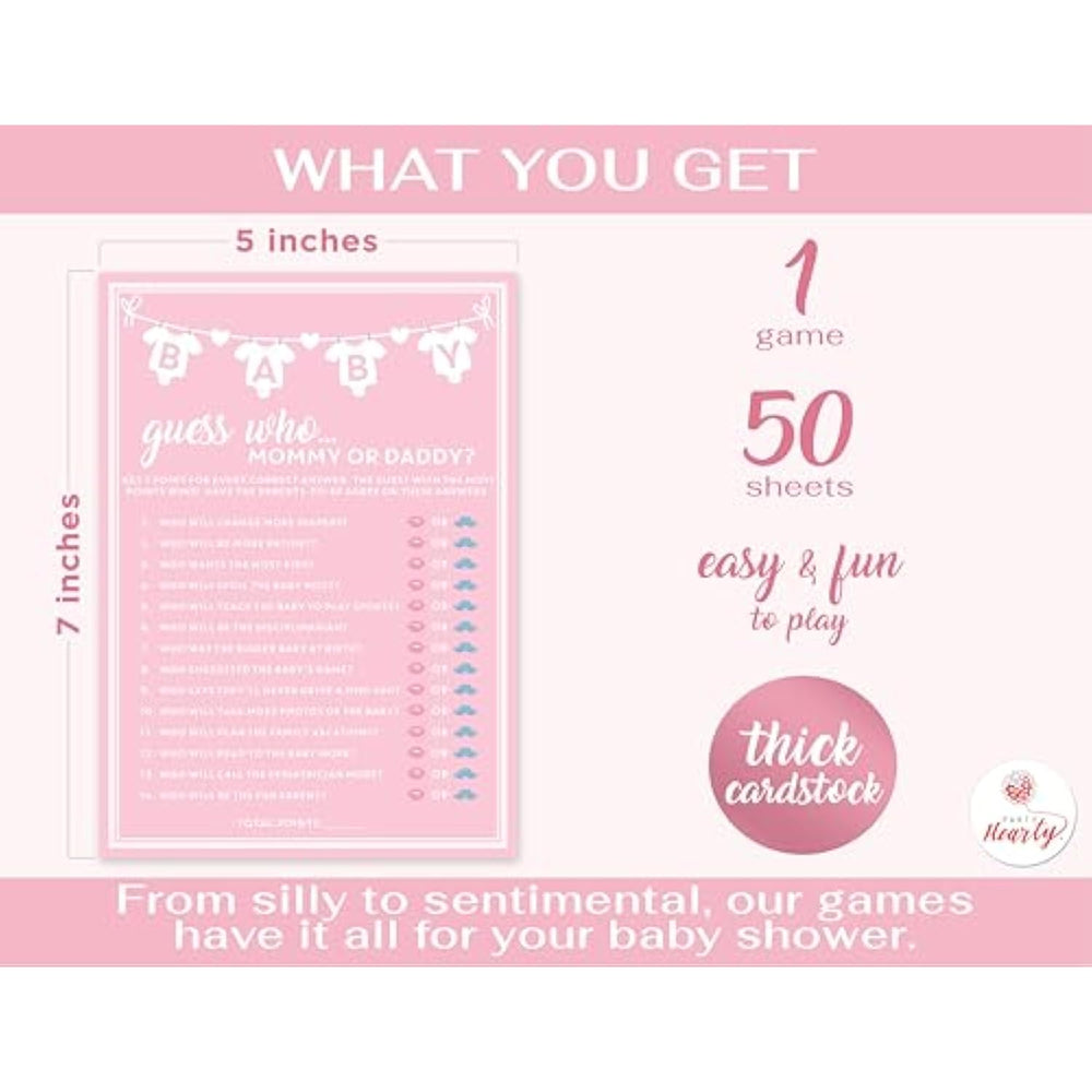 | Transform Your Baby Shower Into An Epic Celebration With Our Fun And Hilarious Baby Shower Games Kit For All; Your Guests Will Have A Blast Playing This Game; The Perfect Baby Shower Activity To Liven Up Your Baby Shower Party | | Baby Shower Game Extravaganza Includes 50 Cards Of Guess Who Mommy Or Daddy; Professionally Printed On Thick Matte Premium Offset Papers, Sturdy Easy To Write On; It Measures Perfectly At 5X7 Inch | | Laugh, Bond, And Win With Our Easy To Play Baby Shower Games Funny For Girl Baby Showers; These Baby Games For Baby Shower Will Be A Great Ice Breaker; Our Goal Is To Make Everything Easy For You; No Special Preparation Is Necessary | | Easy To Play All You Have To Do Is Open The Box And Start Playing; Adult And Coed Will Love The Baby Shower Ideas Of These Girl Baby Shower Games; It Will Fit With Any Baby Shower Theme | | Make Unforgettable Memories These Babyshower Games Set Kits Are Everything That You Need To Create Lasting Memories | |