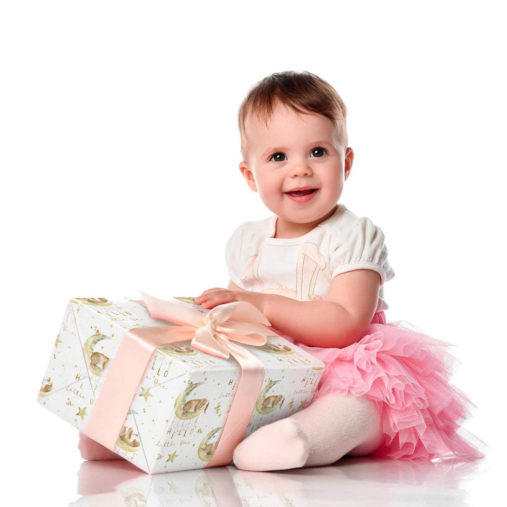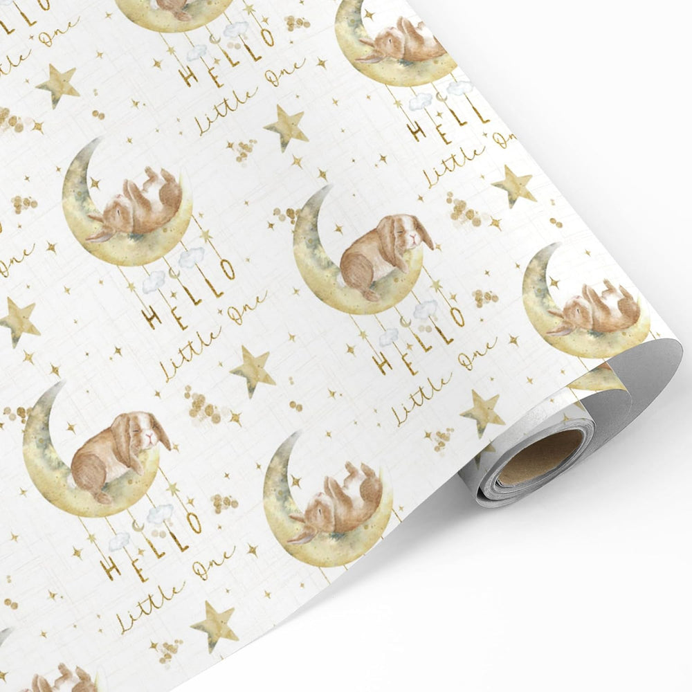 | Baby Shower Wrapping Paper: Our Baby Shower Wrapping Paper Features One Roll Measuring 17.5" × 26 Ft, Making It The Perfect Size For Wrapping Gifts Of Medium And Small Gifts Watercolor Baby Design: Our Gift Wrapping Paper Features Charming Watercolor Bunnies Sleeping On Crescent Moons, Surrounded By Stars And The Phrase "Hello Little One." Perfect For Creating A Memorable Gift Presentation White Holiday Wrapping Paper: Made Of High-Quality Paper With Glossy Finishes, Advanced Printing Technology, Clear Pattern, And Sufficient Paper Thickness, Will Not Be Torn Easily During Packaging Versatile Occasion: Our White Birthday Gift Wrapping Paper Is Good Ideal For Baby Showers, Birthday, Gender Reveal Parties, Newborn Celebrations, Or Any Special Event Celebrating A Little One Professional