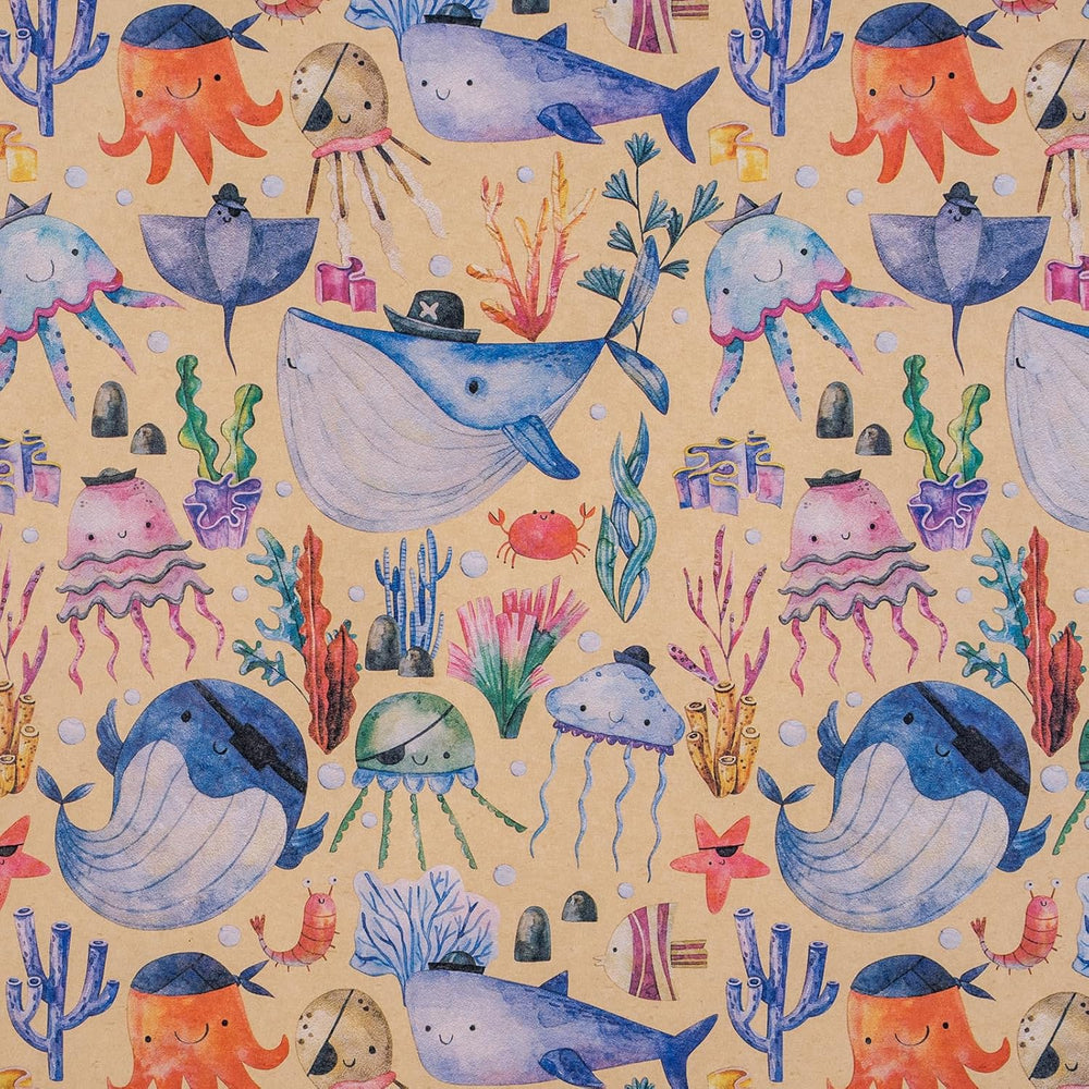 | Pirate And Ocean Design: This Kids' Wrapping Paper Features A Fun Pirate And Ocean Theme, With Vivid Sea Creatures Like Whales, Octopus, And Medusa, Perfect For Creating An Adventurous Atmosphere At Pirate-Themed And Ocean Parties For Kids Easy To Store: Each Gift Wrap Paper Roll Measures 17 Inches Wide By 16.4 Feet Long Is Designed For Convenience, It'S Suitable For Small And Medium Gift Wrap, While Being Easy To Store Among Your Craft Supplies Premium Kraft Paper: Made From High-Quality Kraft Paper Material, Durable And Tear-Resistant, It Ensures Your Gifts Stay Beautifully Wrapped Without Ripping Or Wrinkling, Printed Vibrant Colors, Makes Your Gifts Stand Out Ideal For Kids' Birthdays And Themed Parties: Whether It'S For A Birthday Or A Themed Party, This Kraft Paper Roll Is Perfect For Kids Who Love Pirate Adventures And Ocean Stories, Perfect For Pirate-Themed Parties And Ocean Celebrations Package: The Gift Wrap Paper Comes In Roll Form Consisting Of 1 Separate Individually Wrapped In Plastic, Not Folded So No Creases! Items Are Encased In Shrink Wrap To Protect The Package Against Scratches And Dust