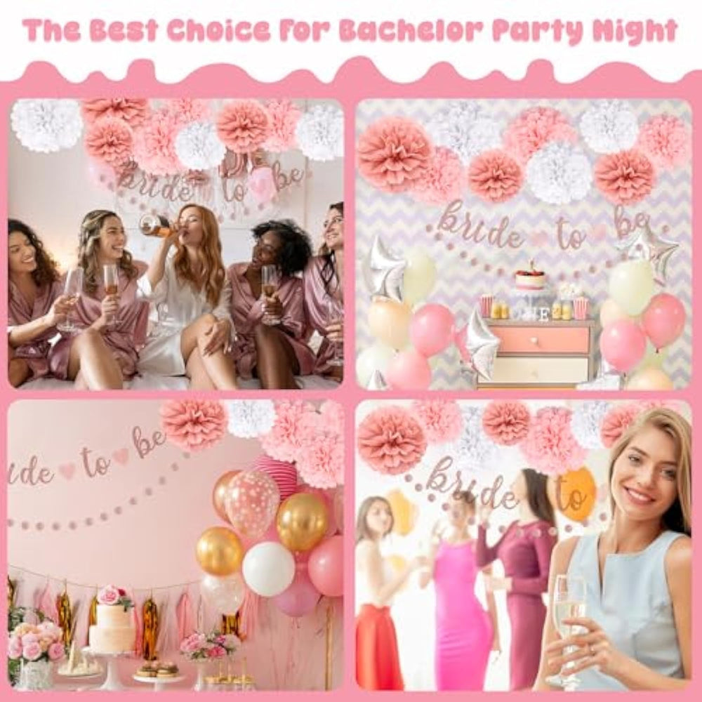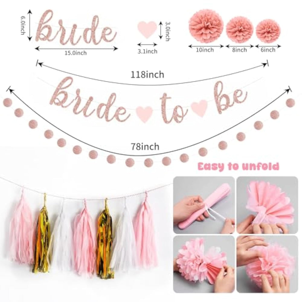 | ?Premium Bachelorette Party Decorations?We Provide Well-Designed Bride To Be Banner Set, Lightweight And Easy To Install And Hang By Hand,It Will Be An Eye-Catching Decoration At The Bridal Shower And Will Wow Everyone At The Shower. | | ?What You Will Get?The Bride To Be Decorations Includes 1Pcs Bride To Be Banner(118"), 1Pcs Fringe Party Curtains(118"*1Pcs), 1Pcs Circle Dots Banner(78"*1Pcs), 9Pcs Honeycomb Balls(10"*3Pcs, 8"*3Pcs, 6"*3Pcs), It Is A Bridal Shower Decoration Banner Specially Designed For Bride To Be. | | ?Pre-Strung Design?: No Need To Waste Time Putting Them Together, Lightweight And Easy To Install And Hang. There Are Steps For Unfolding Honeycomb Balls On The Package, With Just A Few Steps, You Can Easily Unfold The Honeycomb Balls And Decorate Them. | | ?Ideal For Multiple Party?The Perfect Combination Of Shiny Letters And Fringe Party Curtains Can Make The Event Atmosphere Burst, Enhance The Overall Beauty Of The Event, And Bride To Be Sign Is Suitable For Bachelor Party, Engagement Party, Wedding And Other Bride-Related Events. | | ?