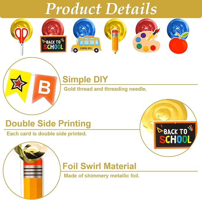 | What You Will Get: The Back To School Set Includes: 1Pcs "Welcome Back" Banner, 1Pcs Apple Pencil Garland And 6Pcs Back-To-School Hanging Swirls. Instantly Ignite The Enthusiasm For Returning To School In The Classroom Or At Home, Making Students Feel Extremely Excited! | | Perfect Material: The Banners And Garland Are Made Of Carefully Selected High-Quality Thick Cardboard, Which Is Waterproof And Wrinkle-Resistant, Saying Goodbye To The Trouble Of Being Easily Damaged. Each Aluminum Foil Vortex Is Made Of High-Toughness Shiny Pvc, Which Is Resistant To Bending, Not Easy To Break, And Can Be Hung Stably. It Will Remain Shiny Throughout The Semester. | | Simple Diy: Banners, Garland And Hanging Swirls Can Be Hung Anywhere You Need. This Banner Is Equipped With Gold Thread And Threading Pins, Making It Easy To Operate. It Allows You And Students To Immerse Themselves In The Atmosphere Of The Back-To-School Season And Create A Party Full Of Fun. | | Perfect Decorations: A Back To School Decoration Set With Cute Patterns Welcomes Your Returning Students And Makes This Fun And Exciting Back-To-School Season Event Special! Suitable For Classroom Or Kindergarten Classroom Decoration. | | Service : This Well-Crafted Back To School Season Decoration Set Is The Perfect Gift For Teachers And Children. We Offer A 100% Risk-Free Satisfaction . If You Have Any Questions, Please Feel Free To