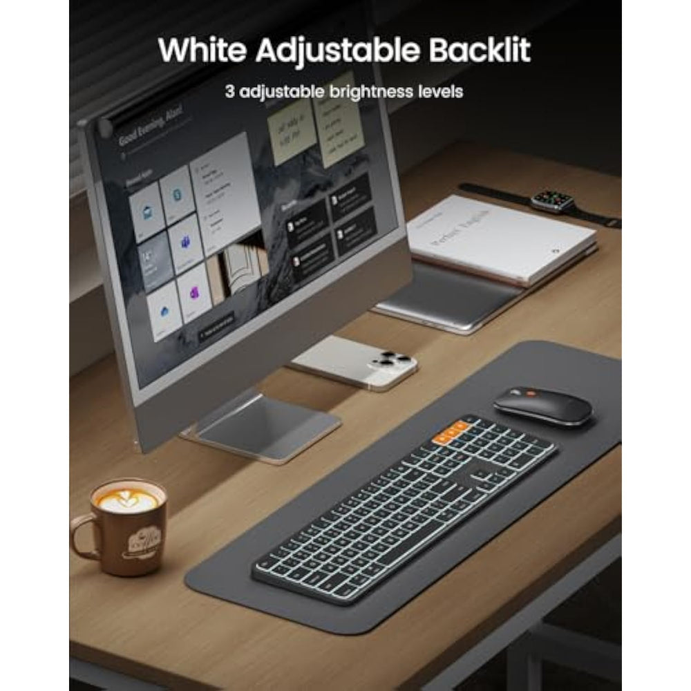 | Bluetooth Keyboard For Mac: Bluetooth Keyboard And Mouse For Mac Resembles Magic Keyboard In Full Size Layout. Compatible With Mac Os 10.12 Or Later, For Macbook, Macbook Pro, Macbook Air, Mac Pro/Mini, Ipad, Or Iphone, Supports Bluetooth 5.1 Version Or Above. Note: Km100-A Keyboard Is Designed Primarily For Macos And May Not Be Fully Compatible With Windows. The Media Keys And Function Keys Don'T Work On Windows. Devices Manufactured Before 2013 And Devices With Mac Os Versions Lower Than 10.12 Are Not Compatible | | Backlit Illuminated Keys: This Backlit Wireless Keyboard For Mac Comes Equipped With Soft White Led Backlighting And Boasts Three Adjustable Brightness Levels (Low-Mid-High) To Suit Your Individual Needs. Perfect For Use In Dimly Lit Environments, The Gentle Illumination Won'T Strain Your Eyes, And The Brightness Can Be Easily Customized To Your Liking | | Switch Up To 3 Devices: Bluetooth Keyboard Mouse For Mac Can Connect To Three Different Devices Simultaneously Through Its Triple Bluetooth Channels. You Can Easily Switch Between The Devices By Clicking On The Mode Switch Button. Note: Connection Is Established Solely Through Bluetooth. Usb Dongle Is Not Included | | Responsive Keys And Quiet Typing: This Keyboard Boasts A Responsive Scissor Switch, Allowing For Efficient And Hushed Typing. The Low-Profile Design And Soft-Touch Keys Elevate The Typing Experience To A New Level Of Fingertip Comfort And The Mouse Features Three Adjustable Dpi Levels Of 1000/1600/2400, Providing You With Customizable Sensitivity Options | | Rechargeable And Power Saving: The Keyboard And Mouse For Mac Feature Built-In Rechargeable Batteries, 1200Mah For Keyboard, 300Mah For Mouse. Additionally, If The Keyboard Is Not Used For 60Min, It Will Enter Sleep Mode And Can Be Awakened By Pressing Any Key. Backlighting Needs To Be Turned On Again | | Flat Keyboard: Keyboard For Mac Is Intentionally Designed To Be Flat For Neutral Wrist Position, Allowing You To Hold Your Wrists Level With Your Fingers While Typing. This Design Minimizes The Risk Of Discomfort And Potential Issues Such As Carpal Tunnel Syndrome | | Notice: Utilize A Full-Size Keyboard And Mouse To Enhance Your Work Efficiency For Mac. However, Please Be Aware That They May Require More Desk Space Compared To Compact Options | |