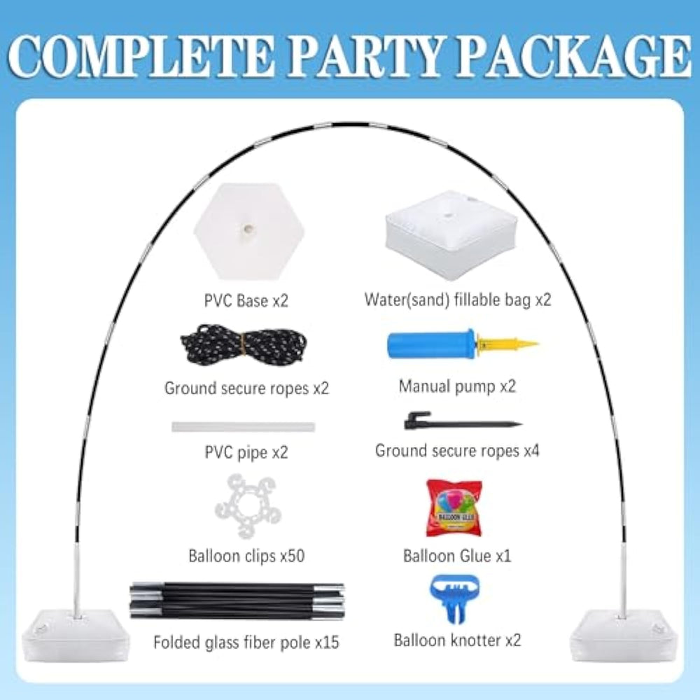 | Easy To Use: The Height And Width Of The Arch Can Be Adjusted At Will By Adjusting The Distance Between The Bases. If You Prepare In Advance To Inflate The Balloon, You Only Need 10 Minutes To Assemble A Balloon Arch | | Suitable For Any Occasion: Balloon Arch Kit Is Very Suitable For Birthday Party, Baby Shower, Anniversary, Graduation Party, Christmas Party And Any Other Table Centerpieces Decoration | | Package Included: Balloon Arch Kit Includes 15 Foldable Fiberglass Rods, 2 Pvc Bases, 2 Pvc Pipes, 2 Water Filling Bags, 2 Handheld Pumps, 50 Balloon Clips, 2 Balloon Tie Tools, 2 Ground Secure Ropes, 2 Hard Plastic Nails, 1 Roll Of Glue, 1 Roll Of Balloon Decoration Tape, Enough To Make Beautiful Balloon Arch For Any Party | | Premium Material: The Foldable Rods Are Made Of Robust And Durable Fibreglass, Which Are Not Easy To Break, And Can Be Reused. Pressed On The Base With A Bag Filled With Water, Very Strong Even In Outdoor Use | | Warm Tips: Please Open The Package And Check It Before The Party Starts. If You Find Any Problem, Please