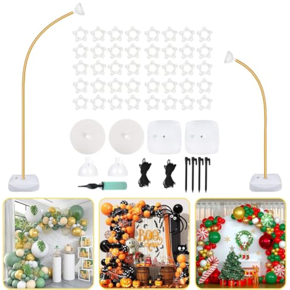 This Balloon Stand Kit is a versatile and durable solution for creating custom balloon arches and columns for any event. Its flexible design allows you to shape your display into heart, circle, or other creative forms, perfectly matching your venue or theme. The kit includes everything needed: 2 balloon holders, 2 water-filled bags, 2 PVC bases, 40 balloon clips, 2 repair tubes, and 1 balloon pump—no extra purchases required. For stability, fill the water bags in advance and use the included ropes and ground plugs. Made with high-quality materials, the stand ensures excellent stability and durability, supporting the weight of balloons and decorations while keeping your setup intact from start to finish. For best results, bend slowly when shaping to avoid damage, and use the repair tubes if needed.