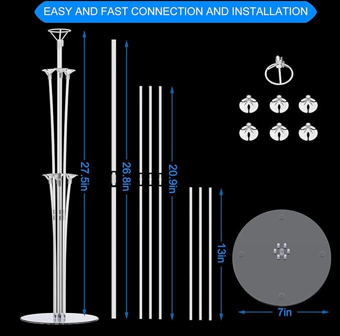This Balloon Stand features a 6.9-inch base diameter with one 28-inch stick, three 23.5-inch sticks, and three 15.5-inch sticks, made from durable transparent plastic and an acrylic base for repeated use. The stand can be quickly assembled with 28 latex or foil balloons in about 3 minutes, following the included instructions, and can be reused for different events. Ideal for birthdays, weddings, baby showers, home décor, photo backdrops, Christmas, Halloween, and other festive celebrations, it provides an attractive and versatile decoration option.
