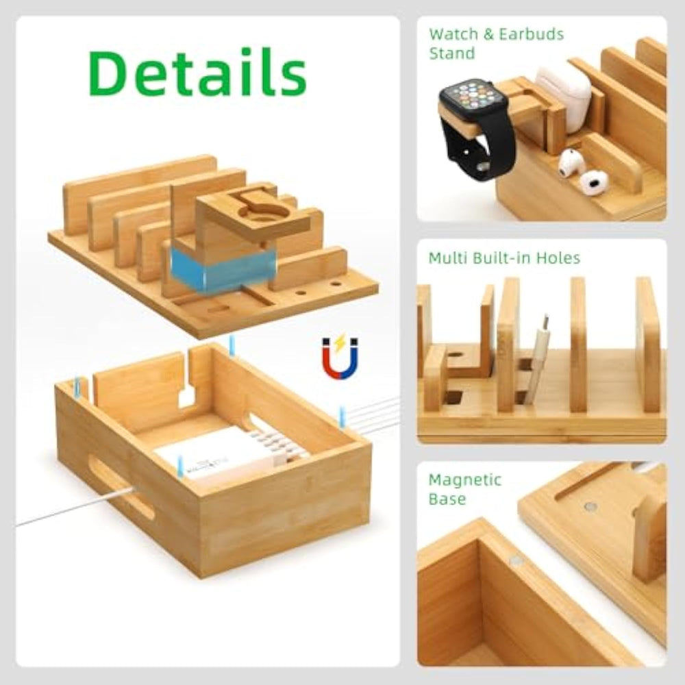 | Premium Bamboo: Crafted From Natural Bamboo, The Natural Texture And Feel Make This Charging Station Not Just Functional But Also A Stylish Addition To Your Desk. Make Charging A Pleasure | | Built To Last: More Sturdy Than Plastic Charging Stations, No Need To Worry About Plastic Parts Breaking, Keeping Devices Stable During Charging | | What You Get: 1 Bamboo Docking Station, 1-5-Port Usb Charger, 1 Watch And Earphone 2-In-1 Stand, 6 Charging Cables (Included 3X1Os, 2Xtype-C, And 1Xmicro Usb) | | All-In-One Charging Solution: With Thoughtfully Designed Slots, Our Charging Station Perfectly Accommos Multiple Devices Like Phones, Tablets, Headphones And Smartwatches. Say Goodbye To Tangled Charging Cables And Embrace A No-Clutter Charging Experience | | Suitable For Multi Occasions: Its Compact And Efficient Layout Maximizes Desk Or Nightstand Space. Ideal For Homes, Offices, Or Study Areas, It Blends Seamlessly Into Your Environment, Enhancing Your Living Quality With Tidy Organization | |