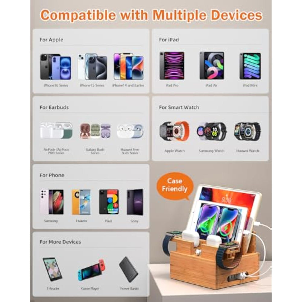 | What You Get: 1 Bamboo Upgrade Charging Station, 1-5-Port Usb Charger, 2- Integrated Watch Earbuds Stand, 5 Charging Cables(Included 2 1Os Cables, 1 Android Cable, And 2 Type-C Cables). You Won'T Worry About Different Charging Requirements For Different Devices And Will Have A Happy And Convenient Life With This Charging Docking Station Organizer. | | 5 Port Usb Charger 5 Pack Charge Cables: The Charger Can Also Be Used Separately, Which Is Relatively Small And Easy To Carry. 5 Usb Output Ports Are Provided To Charge Up To 5 Devices Simultaneously. Perfect For Suitable For A Wide Range Of Occasions, Such As Offices, School, Home, Etc | | Fashion Creative Design: Magnetic Wide Base: Allows You To Hide All Cables And Power Strips Or Usb Hub, Usb Chargers And Keep The Cables Neatly And Save Space. Mobile Watchearbuds Stand- You Can Arbitrarily Place Your Watch And Earbud Thus It Is Space-Saving And Charging Easily. 5 Pack Charging Cable- Support Fast Charging And Data Transfer | | Multi-Device Organizer: Pezin Hulin Bamboo Charging Station Stand Can Hold Up To 7 Devices (Such As Phone, Tablet, Smartwatch, Earbuds, And More Electronic Devices), Simultaneous Maintaining Your Devices In Order And Helps To Clean Up The Stacking Device Charging | | Quality Service: Whether Defective Or Unsatisfactory, We Offer A 12-Months Qa Service For Every Product. If You Have Any Question, Please Drop Us A Line At All Times And We Will Respond Within 24 Hours, Quality Service Is For Every