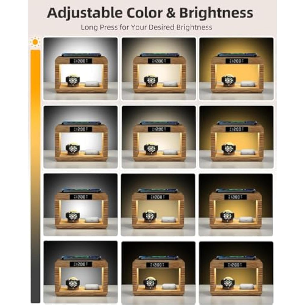 | ???3-In-1 Wireless Charging Station With Alarm Clock Night Lamp??? Tired Of Tangled Cords And Clutter Our Innovative Wireless Charging Stand Combines An Alarm Clock, Customizable Night Light (Offering 3-Color Lights), Phone Wireless Charger, Airpod Charger, And Apple Watch Charger All In One Sleek Design. Declutter Your Nightstand, Office, Or Bedroom, And Embrace A More Organized Lifestyle. (? Note: Watch Charger Not Included) | | ??Poweful Alarm Clock With Adjustable Brightness Volume?? The Clock Offers 2 Brightness Levels, Not Only Allowing You To Easily Read The Time But Also Giving You The Flexibility To Select The Lighting Intensity That Aligns With Your Peaceful Night'S Sleep. 2 Adjustable Volume Of Clock Is Offered To Cater To Different Individuals, Especially Heavy Sleepers(?Under Normal Time Mode, Single Press The "H+" To Adjust The Screen Brightness. Single Press The "M+" To Adjust The Alarm Clock Volume.) | | ??3-Color Night Light With Adjustable Brightness?? With Adjustable Brightness Levels(5%-100%) And 3-Color Temperatures(Warm White/Cool White/White), The Led Table Lamp Meets Your Preferred Light Color And Brightness. Just One Touch Feature Works Flawlessly And Lights Up Your Bedside Lamp. (?With A Simple Touch, Effortlessly Switch Between Colors And Adjust Brightness Levels By Pressing And Holding The Touch-Control.) | | ?? ?Universial Compatibility??? You Can Charge Your Apple Products Simultaneously Through Phone Docking Station: 15W Fast Wireless Charging Mode For Iphone 16/15/14/Pro/Mini/Pro Max/Iphone 13/13 Pro/13 Mini/13 Pro Max/12 With The Latest Ios System; 5W Wireless Charger For Airpods 3/2/1 And Airpods Pro, 3W Wireless Charger For Apple Watch Series 10/9/8/7/6/5/Se/4/3/2 | | ???Safe Fast Charging??? With A Ul-Certified Adapter, Our Wireless Charging Dock Can Simultaneously Charge Your Iphone, Airpods Pro, And Apple Watch. It Incorporates Multiple Safety Features, Including Protection Against Over-Current, Over-Voltage, Over-Temperature, Short-Circuits, And Foreign Substances, Ensuring Both Safe And Fast Charging. To Get A Better Experience, We Would Like You To Take Off The Phone Case | | ??Stylish Bamboo Design For Home Decor?? Crafted From 100% Natural And Sustainable Bamboo, The 5-In-1 Wireless Charging Stand Adds A Touch Of Eco-Friendly Sophistication To Any Room, Be It Your Bedroom, Living Room, Or Kitchen Counter. Its Exquisite Design Is Sure To Enhance Your Bedroom Decor. | | ?????Perfect Present Choice????? This Sleek And Durable Wireless Charger Is The Ideal Present To Pleasantly Surprise Your Loved Ones, Including Your Spouse, Parents, Children, Partner, Siblings, Friends, Co-Workers, Or Even Your Boss, On Occasions Like Birthdays, Anniversaries, Father'S Day, Christmas, And Other Special Moments. Show Your Affection With This Thoughtful All In One Wireless Charger. | |