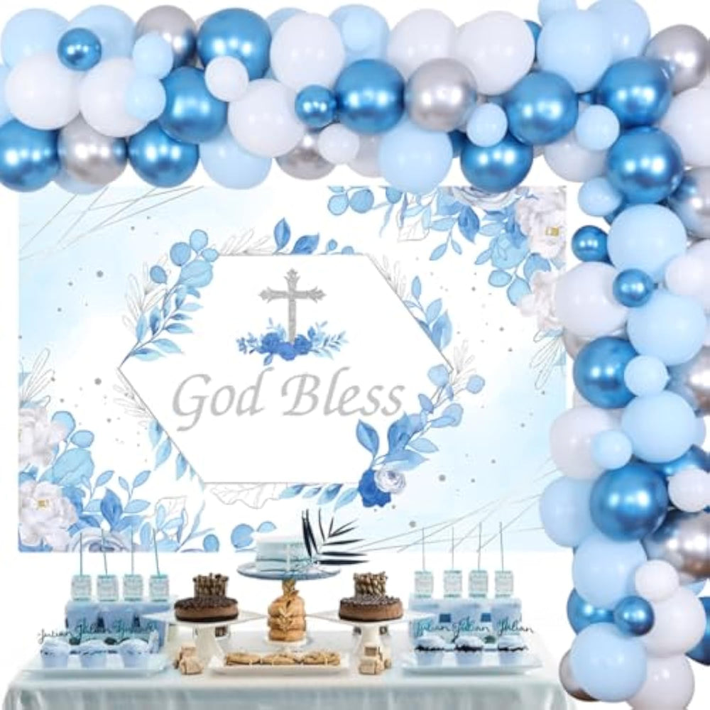 God Bless Party Decorations: In This God Bless Package, You Will Get 60Pcs Latex Balloons 12 Inches, 15Pcs Latex Balloons 5 Inches, 1Pcs God Bless Backdrop 3.28*4.92Ft, 1 Roll Of Adhesive Dispense And 1 Balloon Tape Strip. This Rich Balloon Garland Kit Will Meet All Your Needs For Your Baptism Party! | God Bless Backdrop: The Blue Baptism Backdrop Measures Approx. 3.28*4.92Ft Which And Can Be Used As A Backdrop For Photo And Enhance The Party Atmosphere! The Backdrop Is Printed With Cross, Flowers And “God Bless”. Bright Colors Make It Easier For You To Decorate Your Baptism Party Better. | High Quality: Our Balloons Are Made Of Good Materials, Strong And Long Lasting, Went Through Quality Control And Inspection. This Bright White, Green And Gold God Bless Decorations Set Will Make The First Communion Party Sparkle. | Wide Applications: This Baptism Balloon Garland Is Perfect For Baby Shower, Baptism Party, Wedding, Bridal Shower, Engagement Parties, First Communion Parties, Etc. It Will Make Your Party More Attractive And Everyone Who Attends Will Be Impressed. | Need Your Diy: The Balloons Need Your Creativity And Imagination To Make Them Into A Gorgeous Balloon Arch Garland With Tools Provided, Or You Could Choose To Just Tie Them In Bunches. |
