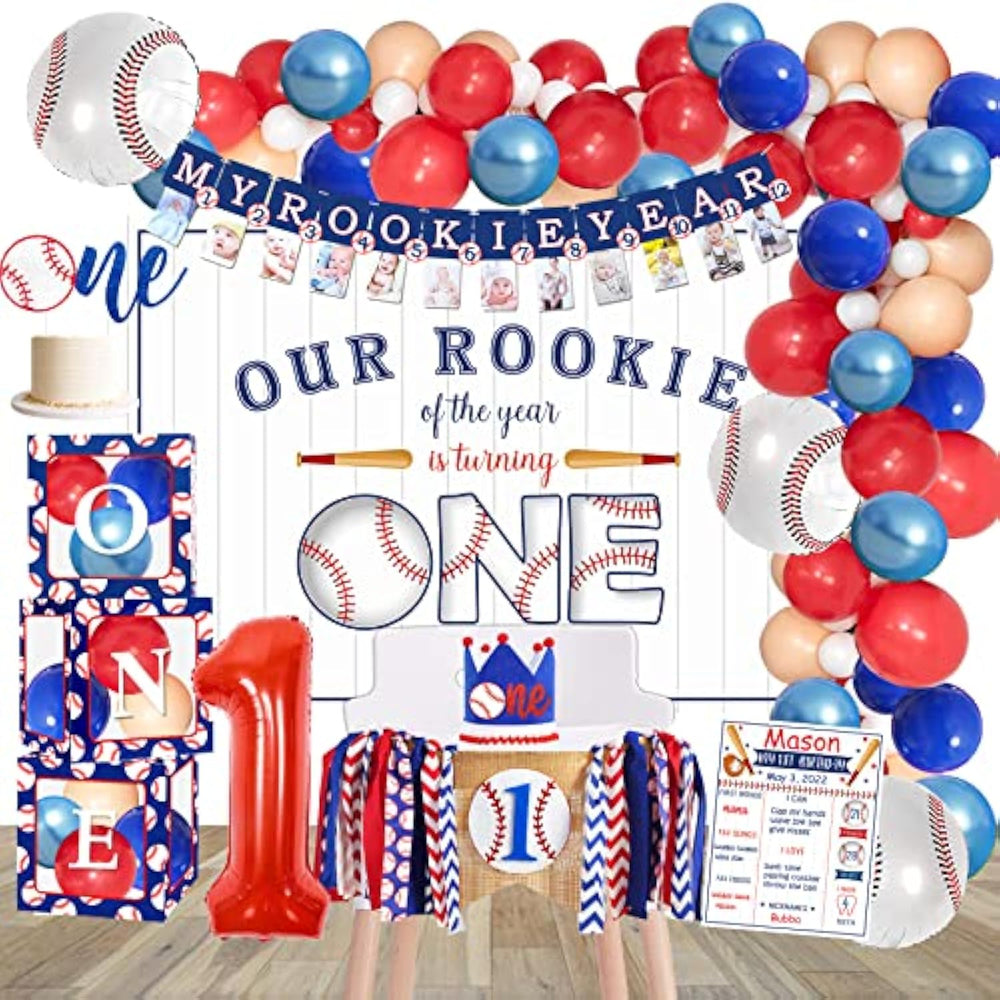 Rookie Of The Year 1St Birthday Decorations - Package Includes: Our Rookie Of The Year Is Turning One Backdrop, 3Pcs Baseball 1St Birthday Balloon Boxes, My Rookie Year 1St Birthday Monthly Photo Banner, Baseball 1St Birthday High Chair Banner, Number 1 Foil Balloon, One Cake Topper, Baseball First Birthday Crown, 1St Birthday Milestone Poster, 102Pcs Baseball Theme Balloon Garland Set. | Premium Quality Best Bang For Your Buck - Our Rookie Of The Year Birthday Party Decorations Are Made From Premium Quality Materials. Everything You’Ve Ever Thought Of For Your Baby'S One Year Old Birthday Party Is Now In This Set, Eliminate The Need To Go-Shopping For Individual Elements(Otherwise Ending Up Spending More Money And Wasting More Time). Moreover, Superior Print Quality And High Attention To Details Are Sure Make Your Baby'S First Birthday Parties Stand Out. | Baseball 1St Birthday Party Supplies - Classic Colors And Cute Designs: This 1St Birthday Baseball Decoration Adopt Classic Baseball Themed Colors, Namely Red, White And Blue, Combined With Cute Little Baseball And Baseball Gloves Designs, Which Are Eye Catching And Interesting, Will Leave A Deep Impression On Your Guests. |