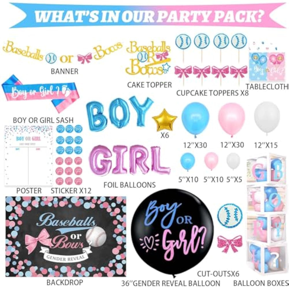 | What Will Baby Be –What Will The Baby Be It Would Be So Fun To Have A Gender Reveal Under The Theme Of Baseball Or Bows. These Decorations Will Sure To Light On This Adorable Party. All Of The Friend Will Be Immersed In Excitement, And They Can’T Wait To Know What Gender This Baby Would Be. Baseball Or Bows | | Baseball Or Bows Gender Reveal Decorations Includes - 100 X Latex Balloons | 8 X Foil Balloons | 1 X Black Gender Reveal Balloon | 2 X Confetti | 1 X Backdrop | 1 X Banner | 1 X Tablecloth | 9 X Toppers | 4 X Boxes | 16 X Cutouts | 1 X Sash | 1 X Poster | 24 X Stickers | Poster Stand | Balloon Strip | Glue Dots | Ribbons | | Time-Saving – Our Baseball Or Bows Gender Reveal Decorations Kit Contains All You Can Wish For A Gender Reveal Party And These Were Easy To Assemble. There Is Visual Instruction For Your Convenience. All Steps Only Take A Few Minutes. Please Enjoy Decorating Your Party Place! It Will Be A Wonderful Party Which Is Made By You | | Premium Quality And Versatile - This Bundle Is Made Of High-Quality Material And Is Environmental Protection. Pink And Blue Is A Vivid And Cute Color Scheme. Some Of The Decorations Could Be Reused For The Gender Reveal, Baby Shower, Themed Party, Bridal Shower, Anniversary | | Satisfactory