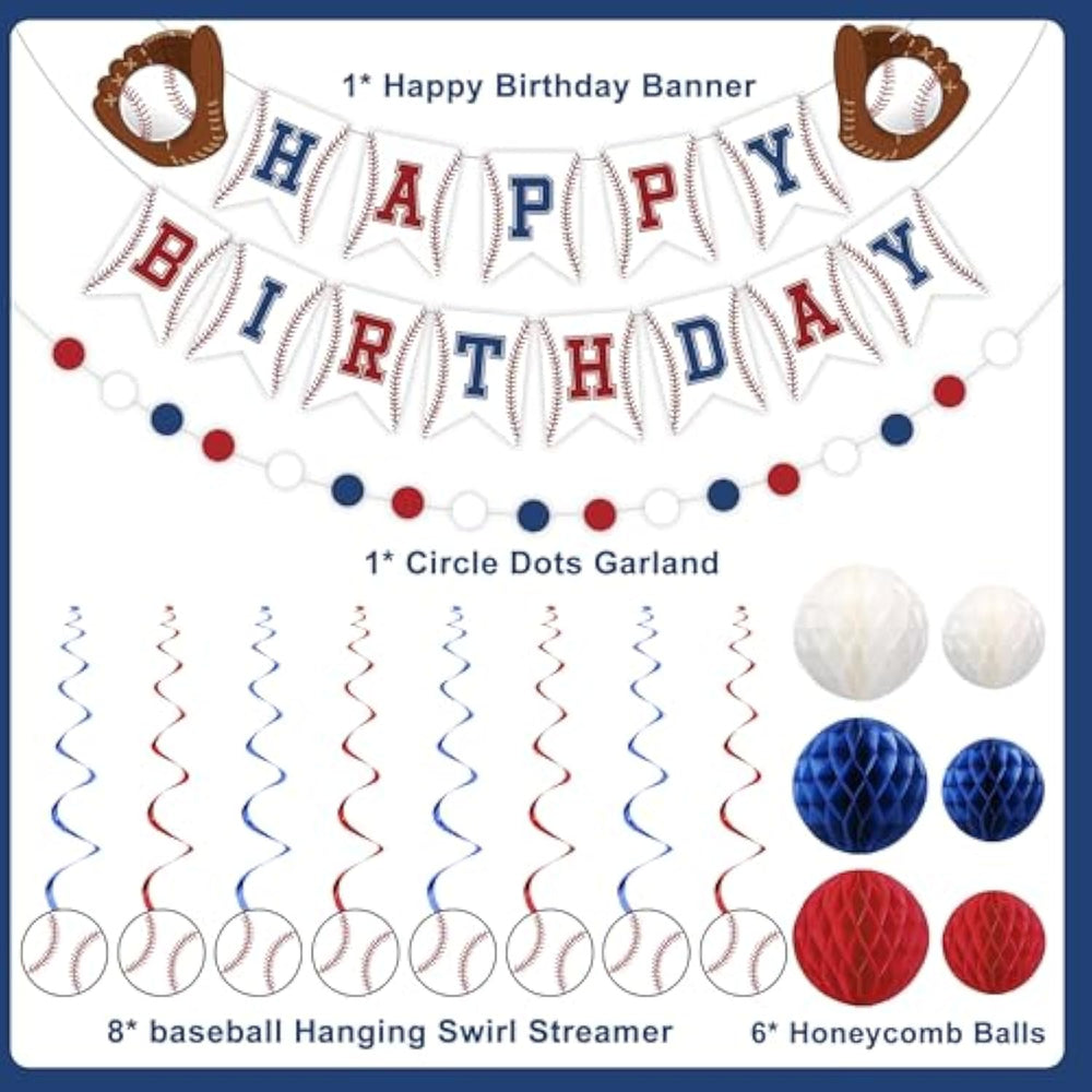 | Value Pack: You Will Receive A Set Of Baseball Party Decorations, Including 1 Piece Of Happy Banner, 1 Piece Of Birthday Banner, 8 Pieces Of Baseball Themed Paper Cards With Hanging Swirls, 6 Pieces Of Honeycomb Balls And 1 Piece Of Circle Dot Garland, Sufficient Quantity To Meet Your Party Decoration Needs. | | Unique Design: The Happy Birthday Banners And Honeycomb Balls Feature A Classic Baseball Theme, With Red, White And Blue As The Main Colors, And Printed With Many Theme Patterns, Such As Baseball, Gloves And More, Adding More Fun To Your Party, Suitable For Those Who Loves Baseball. | | Premium Quality: The Baseball Birthday Party Decorations Are Made Of Quality Cardboard, Thick And Sturdy, Lightweight And Smooth, With Bright Colors And Vivid Printing, Not Easy To Break, Fade Or Bend; The Honeycomb Balls Are Easy To Store And Carry, Does Not Take Up Much Space, Suitable For Long Term Use. | | Easy Set Up: These Happy Birthday Banner, Honeycomb Balls And Hanging Swirls Are Convenient To Use, You Can Easily Assemble Them Without Much Effort, Saving Your Valuable Time, And They Will Create A Fun And Lively Party Atmosphere, Perfect For A Sports Themed Surprise Birthday Party! | | Wide Range Of Use: The Sports Party Decoration Kit Is Perfect For Birthday Party, Sports Theme Party, Photo Booth Backdrop And More, You Can Hang Them On The Ceiling, Wall, Window, Door, Fireplace, Table, Bedroom, Living Room And More, It Will Make Your Baseball Birthday Party Unforgettable. | |