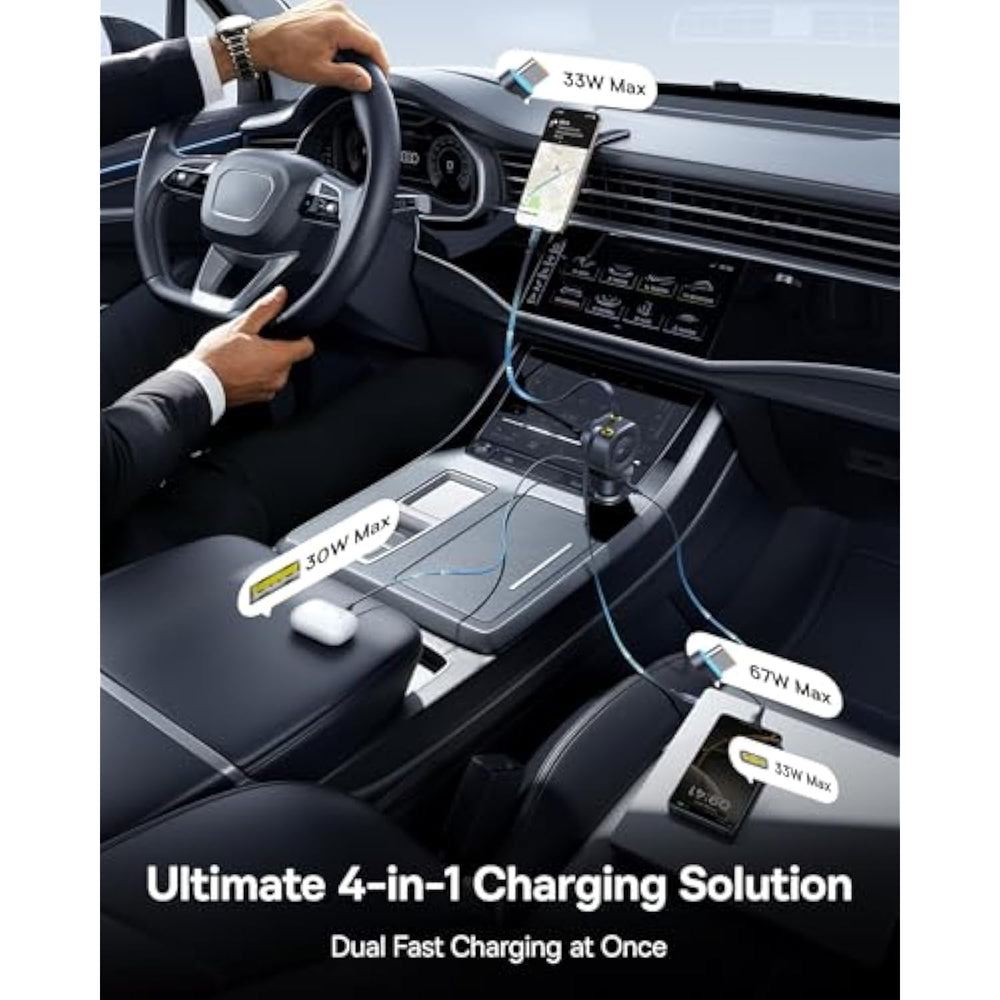 | 163W Retractable Car Charger: Experience lightning-fast charging for seamless office work on the go. Designed to support high-power devices such as laptops, tablets, and smartphones, this fast charging car charger ensures your road trips and daily commutes hassle-free. It includes a 67W USB-C1 cable output, a 33W USB-C2 cable output, a 33W USB-C3 port output and a 30W USB-A port output, a total of 163W | | Charge 4 Devices Simultaneously: This super fast car charger features an advanced power allocation system, delivering 67W high-power single USB-C output while sharing 33W across three extra ports (2 USB-C + 1 USB-A). Charge your laptop fast while keeping other devices powered and ready to go. What a smart and compact retractable car charger 4.68" × 2" × 1.57" | | Built-in Dual 31.5-Inch Retractable Cables: Say goodbye to cable clutter with Baseus retractable car charger. This car fast charger integrates two built-in retractable USB-C cables with secure magnetic storage, always keeping your car interior neat and organized whether in use or after used. The dual cables are tested to endure over 10,000 smooth pulls and retractions, built to last and accompany your every journey with reliability and peace of mind | | 450° Multi-Directional Adjustment: Customize your charging experience with ultimate flexibility. Featuring 180° vertical rotation and 270° horizontal rotation, this USB-C car charger will automati