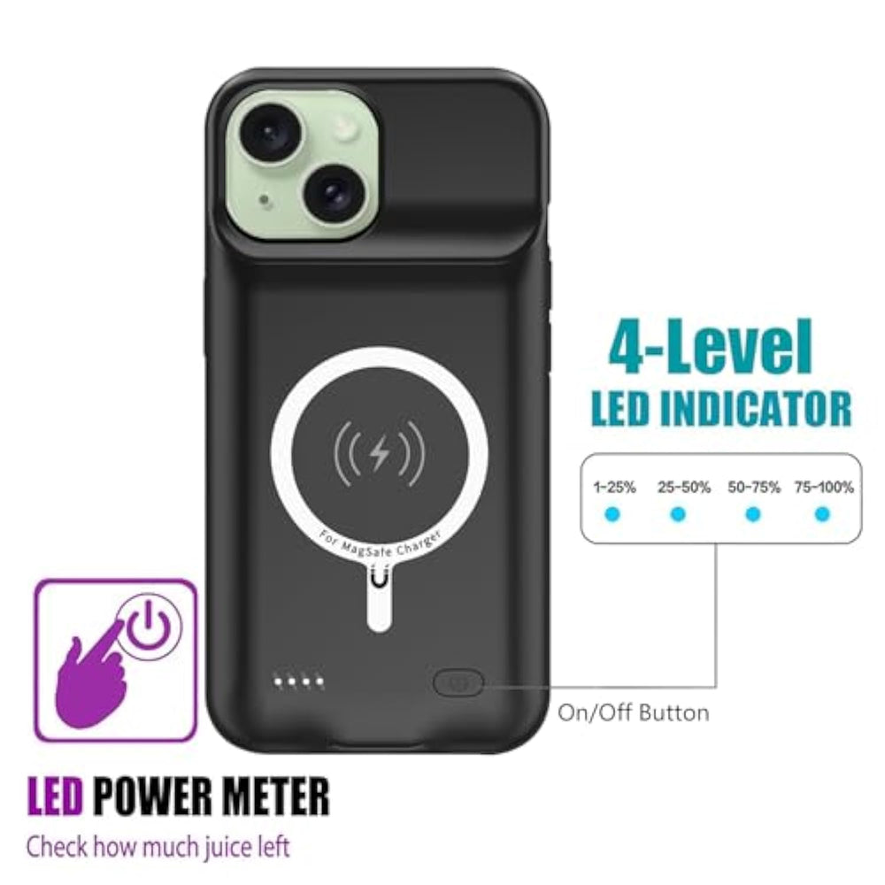 | Ync Portable Built-In 10000Mah , Add Extra 150% Backup Battery For Iphone 15 Wherever You Need It. Perfect For Traveling, Camping, Business Trip Or Other Outdoor Occasions. Thin And Fit Your Hands Well. Easy To Carry. | | Upgraded Design With Qi Wireless Charger ,The High-Capacity Charging Case Can Be Extended For Your Iphone 15 , And You Can Keep In Touch With Your Family Or Friends Anytime, Anywhere. The Case Battery And Iphone 15 Can Be Charged Via Qi Wireless Pad At The Same Time And Support Carplay. ?Included Data Cable And Glass Film? | | 360° Full Protection : The Iphone 15 Battery Case With Upgraded Raised Bezel Design, Camera Protection And High Quality Backplane Can Protect Your Phone From Daily Scratches,Wear And Tear. Built-In Smart Chips To Protect Your Smart Phone From Overheating, Short-Circuiting, Over Charging, And Discharging. Certificated By Ce, Fc And Rohs. This Is A Portable Product That Can Be Carried On The Plane. | | 4 Led Power Indicator : This Iphone 15 Battery Pack The Features Of 4 Led Battery Level Indicator Letting You Know Exactly The Power You Have (25%--50%--75%--100%); Besides, You Could Switch On/Off The Battery Case With The Power Switch Button On The Bottom. | | What You Get : Smart Rechargeable Battery Case X 1,Tempered Glass Film X 1?Charging Cable X 1,User Manual X 1,Our Worry-Free