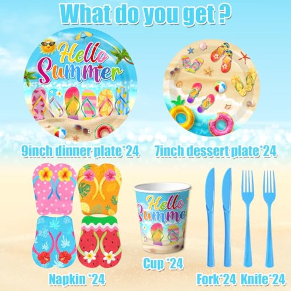 | ?Beach Theme?Our Beach Party Plates And Napkins Sets Are Full Of Various Beach Elements: Colorful Flip-Flops, Beach Ball, Swim Rings, Seashells, Hibiscus Flowers, Palm Trees With Sunshine, That Is Embellished With Elegant Letters “Hello Summer”. Fantastic Design Creates A Relaxing Atmosphere For Beach Theme Party. | | ?Serve 24 Guests?144Pcs Summer Party Decorations Include 24 Dinner Plates (9"), 24 Dessert Plates (7"), 24 Flip-Flops Napkins (6.5" X 5.5" Folded), 24 Paper Cups, 24 Plastic Knives And 24 Plastic Forks. Great Addition To Beach Party Decorations. | | ?High Quality?Hawaiian Plates And Napkins Party Supplies Are Made Of Premium Thick Paper And Plastic (Knife And Fork), Which Is Sturdy, Non-Toxic, Not Easy To Bend, Fold Or Tear. Napkins Are Soft To Touch, Not Easily Tear And More Absorbent With 2 Layers. Features Vivid Pattern That Is Printed Clearly. | | ?Occasions?Hello Summer Plates And Napkins Sets Are Perfect For Beach Themed Party, Beach Birthday Party, Beach Bachelorette Party, Beach Baby Shower, Surf Themed Party, Summer Themed Party, Hawaiian Themed Party, Hawaiian Luau Graduation Party, Luau Themed Party, Aloha Themed Party, Tropical Themed Party, Island Themed Party, Miami Party, Sea Themed Party, Ocean Themed Party, Pool Themed Party, Bbq Party, Etc. Impress Your Guests And Have An Amazing And Unforgettable Time! | | ?Save Time?Aloha Party Tableware Is Time-Saving, Simply Throw Them Away After Party So That You Can Spend More Time With Family And Friends. | |