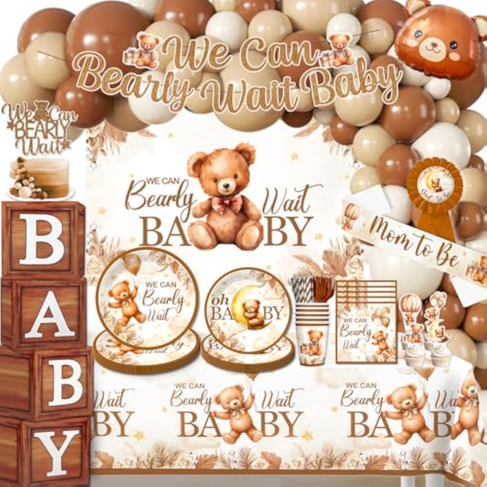| One-Stop We Can Barely Wait Baby Shower Decorations: Our Teddy Bear Baby Shower Decorations Are Designed To Welcome Little Bear On The Way. The Set Includes 1 "We Can Bear Wait" Banner, 1 Backdrop, 1 Mom To Be Sash, 1 Dad To Be Pin, 4 Balloon Boxes, 1 Cake Topper, 12 Cupcake Toppers, 20-Pack: 7-Inch And 9-Inch Plate, Napkin, Paper Cup, Fork, Straw, 2 Tablecloths And 105 Balloons, Ensuring Your Neutral Or Bear Theme Baby Shower Is Flawless | | Easy To Clean: Our Teddy Bear Baby Shower Decorations Are Disposable, So There’S No Need To Wash Them After Use. The Bear Baby Shower Plates And Tablecloths Are Designed To Be Leak-Proof, Ensuring No Mess During The We Can Barely Wait Baby Shower. After The Bear Themed Baby Shower, You Can Simply Toss Everything Away, Making Cleanup Easy And Allowing You To Enjoy Precious Moments With Family And Friends | | Excellent Quality: All Our Brown Bear Baby Shower Decorations Are Printed Clearly, Not Easy To Fade, And Very Exquisite. Most Of Our Neutral Baby Shower Decorations Are Made Of Paper, Clean And Pollution-Free, And Can Be Used With Confidence By The Elderly And Children. The Teddy Bear Plates Are Made From Sturdy 300Gsm White Cardboard. They Are Strong And Won’T Bend Easily, Suitable For Holding Cakes And Food | | Unique Design: Featuring Adorable Teddy Bear And Boho Print Patterns, Our Brown Bear Baby Shower Decorations Create A Warm And Inviting Atmosphere, Suitable For A "Brown Bear", "Teddy Bear Baby Shower", "Bear Baby Shower", "Neutral Baby Shower"And So On. They Capture Guests' Attention And Leave A Lasting Impression, Helping You Host A Memorable Bear Baby Shower | | Wide Use: Teddy Bear Baby Shower Decorations Are Suitable For Various Occasions, Especially For Neutral Baby Shower ,Brown Baby Shower, Gender Reveal Decorations Neutral Colors, And Any Family Gatherings Or Festivals. Whether Indoors Or Outdoors, Our Bear Baby Shower Decorations Will Add A Delightful Touch To Your Celebration, Ensuring Every Guest Enjoys This Sweet Moment | |