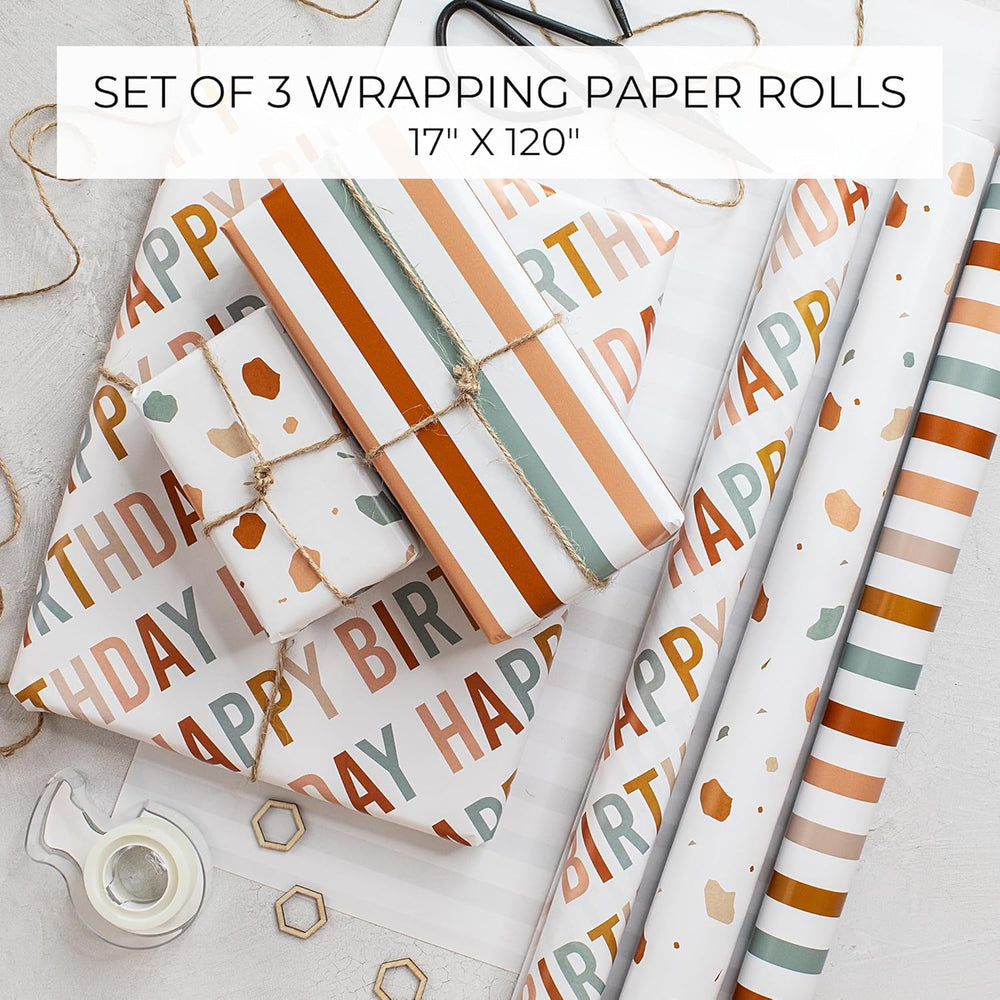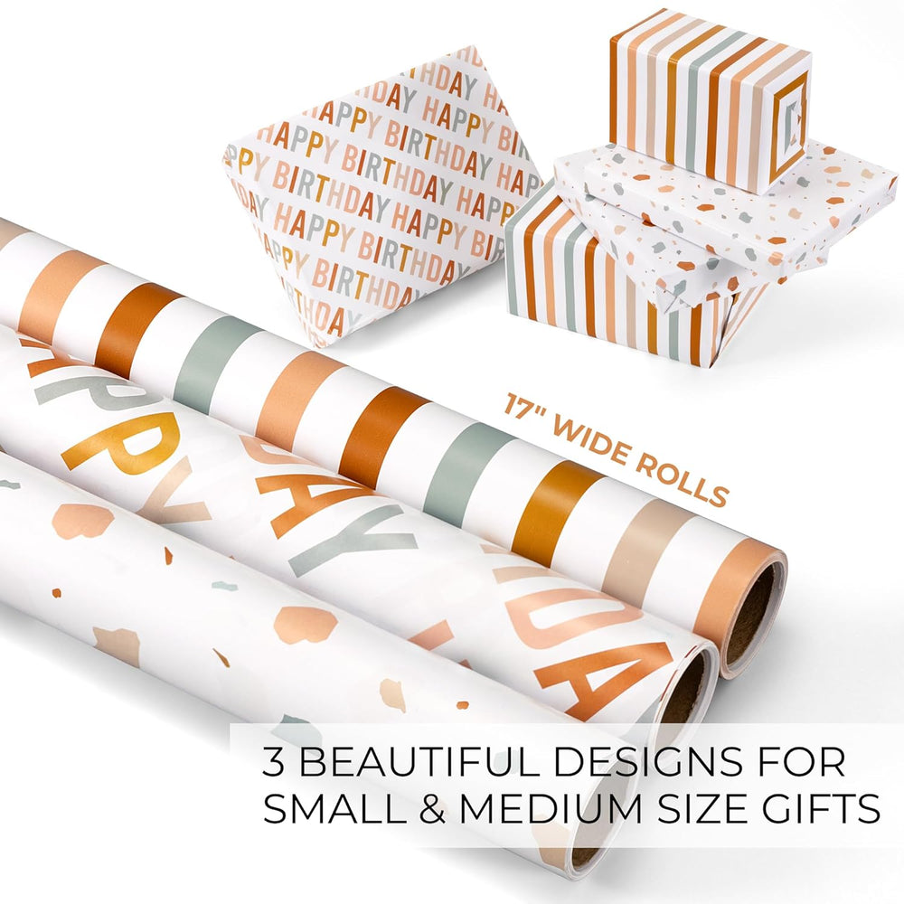 | Set Of 3 - For Endless Celebration: Three’S A Charm! From Birthdays To Everyday Surprises - Wrap Your Thoughtful Gifts Beautifully With S’ Happy Birthday Wrapping Paper Roll Set. Perfectly Sized And Perfectly Chic, Wrapping Made Simple, Fun And Fabulous! Beautiful Designs - Ready For Birthdays Beyond: The Birthday Gift Wrap Paper Adds Instant Elegance! One Roll Features A Cheerful Yet Sophisticated "Happy Birthday" Lettering, While The Other Two Boast Versatile, Understated Designs Making Your Gifts Shine For Any Occasion Sized Just Right: Each Roll Measures 17”X120" - Ideal For Small To Medium-Sized Gifts. The Wrapping Paper Roll Set Comes In A Perfect Size, So No More Awkward Wrestling With Oversized Paper. Wrapping That Fits Yes, Please! Gifts That Wow Before They’Re Opened: Every Gift Wrapped With Love Brings An Extra Dose Of Joy. The Thoughtful, Playful Designs Create Excitement And Anticipation, Making Your Gifts Feel Even More Special Before They’Re Unwrapped! Wrap With Ease, Gift With Love: Upgrade Your Wrapping Game With Ease! The Top-Notch Wrapping Paper For Birthday Handles Folds And Tape Beautifully, Making The Wrapping Process Smooth And Your Gifts Look Effortlessly Perfect