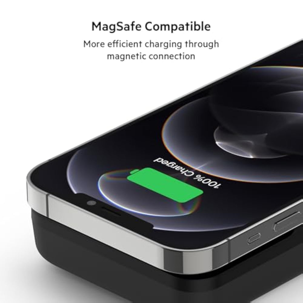 | MAGSAFE COMPATIBLE: The Belkin BoostCharge Magnetic Power Bank can fast charge Apple iPhone 17 phones with speeds up to 7.5W, or connect directly using included USB-C cable to charge at up to 18W of power. | | EXTRA LONG BATTERY LIFE: With a capacity of 10,000 mAh, this MagSafe compatible battery pack provides up to 34 hours of video playback for your iPhone. | | POWERFUL MAGNETIC CONNECTION: The magnetic portable charger uses MagSafe technology to ensure perfect alignment. Even with one hand the embedded magnetic system allows you to easily attach the battery pack to your iPhone without any hassle. | | MULTIFUNCTIONAL USAGE: Using the included USB-C cable, plug the phone charger in at home or in your office to use as a wireless charging pad, or disconnect and take it with you as a magnetic portable charger. | | SIMULTANEOUS CHARGING: This wireless portable charger also allows you to charge 2 devices at once Place an iPhone on it for wireless charging and utilize the USB-C cable to simultaneously charge a second device. | |