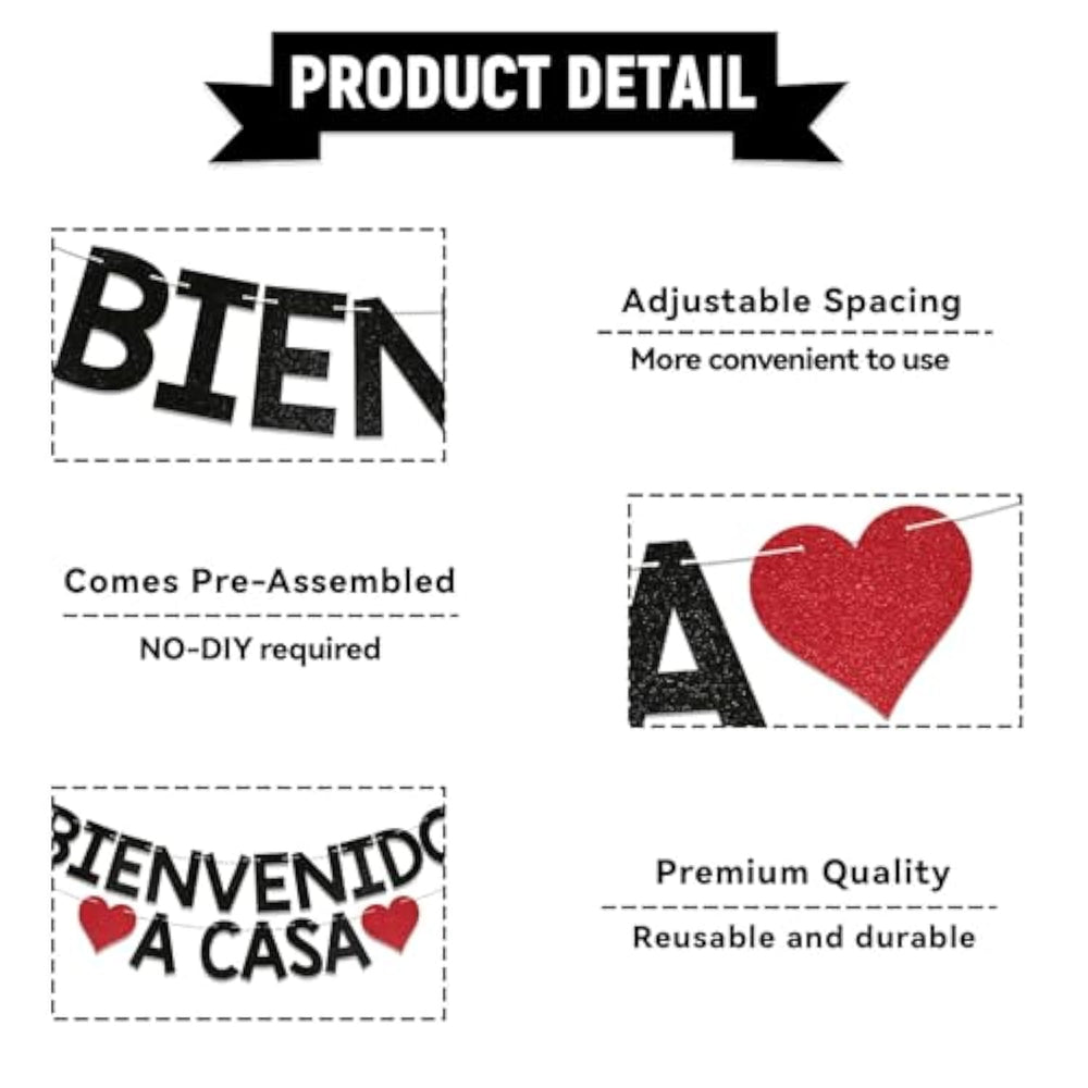 | ??????????????????? ????????????????????? The "Bienvenido A Case"Mexican Spanish Welcome Home Party Decor Banner Has Bright And Vivid Colors, Clear Font Cuts And Novel Style, Which Is The Latest Design Of Our Store In 2025. | | ?????????? ???????????????? The Banner Is Made From Thick, High Quality Cardstock And Each Letter Is Made From 400Gsm Glitter Paper. The Surface Of The Banner Is Glittering And Very Eye-Catching. | | ????????-?????????????? No Need To Assemble It By Yourself. After You Get The Product, Just Unpack The Product And Then You Can Hang The Product On Walls, Cabinets And Windows For Party Decoration And Create A Party Atmosphere Easily. | | ???????????????????? The Banner Is Reusable. They Can Be Folded And Put Away After Use, So You Can Use Them Again And Again For Future Celebrations. | | ????????????-?????????? ???????????????? If There Is Any Problem With The Product And It Doesn'T Meet Your Expected Standard, Please Tell Us, We Will Provide The Best Solution To Ensure Your Shopping Experience! | |