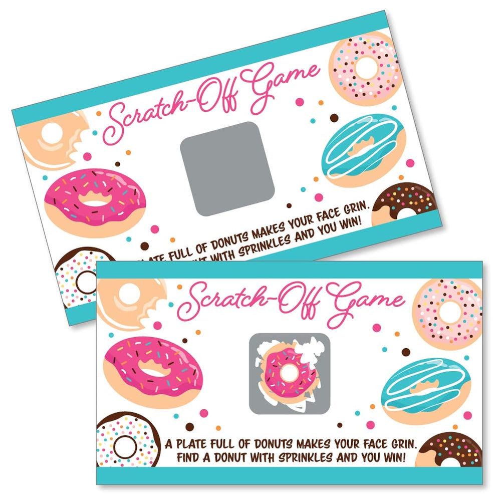| Donut Worry, Let’s Party Scratch-Off Cards INCLUDES 22 doughnut game cards: 20 "loser" cards and 2 "winner" cards. | | FUN PARTY GAME: Donut Worry, Let’s Party scratch-off cards will be enjoyed by doughnut party guests of all ages. Each game card measures 2.75” tall x 4.75” wide. Winner and loser game cards are packaged separately so it is easy to pre-select the game winners if you choose. | | 3 WAYS TO PLAY: Simple - Greet guests as they arrive and hand them a scratch-off card. Quick - Display one scratch-off card at each place setting and have guests play before eating. Favorite - Give scratch-off cards out as mini prizes during other party games. The winning scratch off card(s) gets a grand prize. | | HIGH-QUALITY PARTY SUPPLIES: Donut Worry, Let’s Party Scratch-Off Cards are professionally printed on heavy-duty cardstock paper with a photo-like shine. They are individually inspected and carefully packaged by hand, with winner cards and loser cards clearly marked. This fun doughnut game will arrive ready to use at your party. | | MADE IN THE USA: Donut Worry, Let’s Party - Doughnut Party Game Scratch Off Cards are designed and manufactured at our Wisconsin facility using materials that are Made in the USA. | |