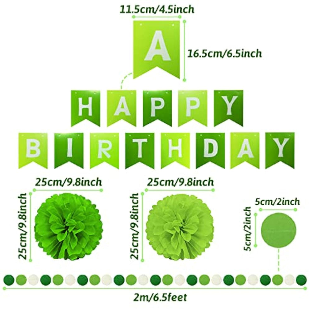 ?Green ?1 X Happy Birthday Banner, 4 X Green Paper Pompoms, 4 X Light Green Paper Pompoms, 5 X Green Hanging Swirls, 10 X Green Balloons, 10 X Green Confetti Balloons, 2 X Green Star Foil Balloons, 1 X Star Paper Garland. | ?Easy To Assemble?The Tissue Pompoms Are Individually Packed With Easy To Follow Instruction. Ribbon Is Included. It Is Shipped Flat And What You Need To Do Is To Fluff It Out And Hang.There Is A Hook On The Top Of Every Swirl,Easy To Directly Hanging It On The Wall,Doorway,Hall,Windows,Porch Or Ceiling. | ?Safety In Use?The Party Suppliers Made Of Superior Quality Material, Provide A Safe Environment. Paper Pompoms Made Of High Quality Eco-Friendly Paper, Environmental Pure Wood Pulp, Can Be Used Again And Again. Brighter Colors, Thicker Paper And More Stable Adhesives, Make Our Fiesta Party Decorations More Upscale. | ?Great Color Combination?Perfect For For Women Girls 18Th 21Th 40Th 50Th 60Th 70Th 80Th 90Th Birthday Party Supplies And More.A Dreamy Background For Your Event. | ?After-Sales Service?If You Have Any Questions About Our Party Decorations Set, Please Feel Free To