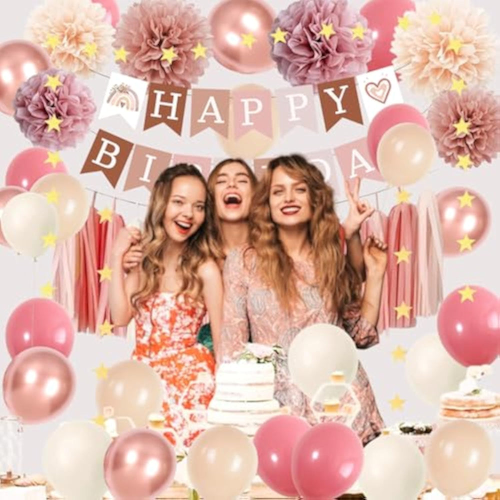 | Retro Blush Pink Birthday Decorations: Boho Party Decorations Set Includes: 12-Inch Latex Balloons X23 (Retro Pink, Light Skin, Metallic Rose Gold, Sand White); Tassel Garlandx1; Happy Birthday Banner X1; Star Pull Flag X1; Paper Pompoms X6, Balloon Glue | | Birthday Decorations For Women: This Birthday Decoration Kit Is Perfect For Retro Rustic Style Birthday Parties, Boho Chic Birthday Decorations. Retro, Elegant Decor Are Perfect For 1St, 13Th, 15Th, 16Th, 18Th, 20Th, 21St, 25Th, 30Th, 35Th, 40Th, 45Th, 50Th, 55Th, 60Th.Etc Birthdays For Women Or Birthday Parties For Young Girls | | High-Quality Materials, Thick And Durable: High-Quality Paper And Cardstock, Not Easy To Bend And Fade, Not Easy To Tear; Natural Latex Balloons, Good Ductility, Durable And Not Easy To Break; Accessories For Birthday Party Supplies Can Be Used Many Times | | Easy To Assemble: Happy Birthday Banner Are Linked With Ribbons, Star Pull Flags Are Assembled, But Tissue Pompoms Need More Time To Assemble, Please Follow The Instructions To Assemble By Yourself. It Takes About 20 Minutes To Complete All | |
