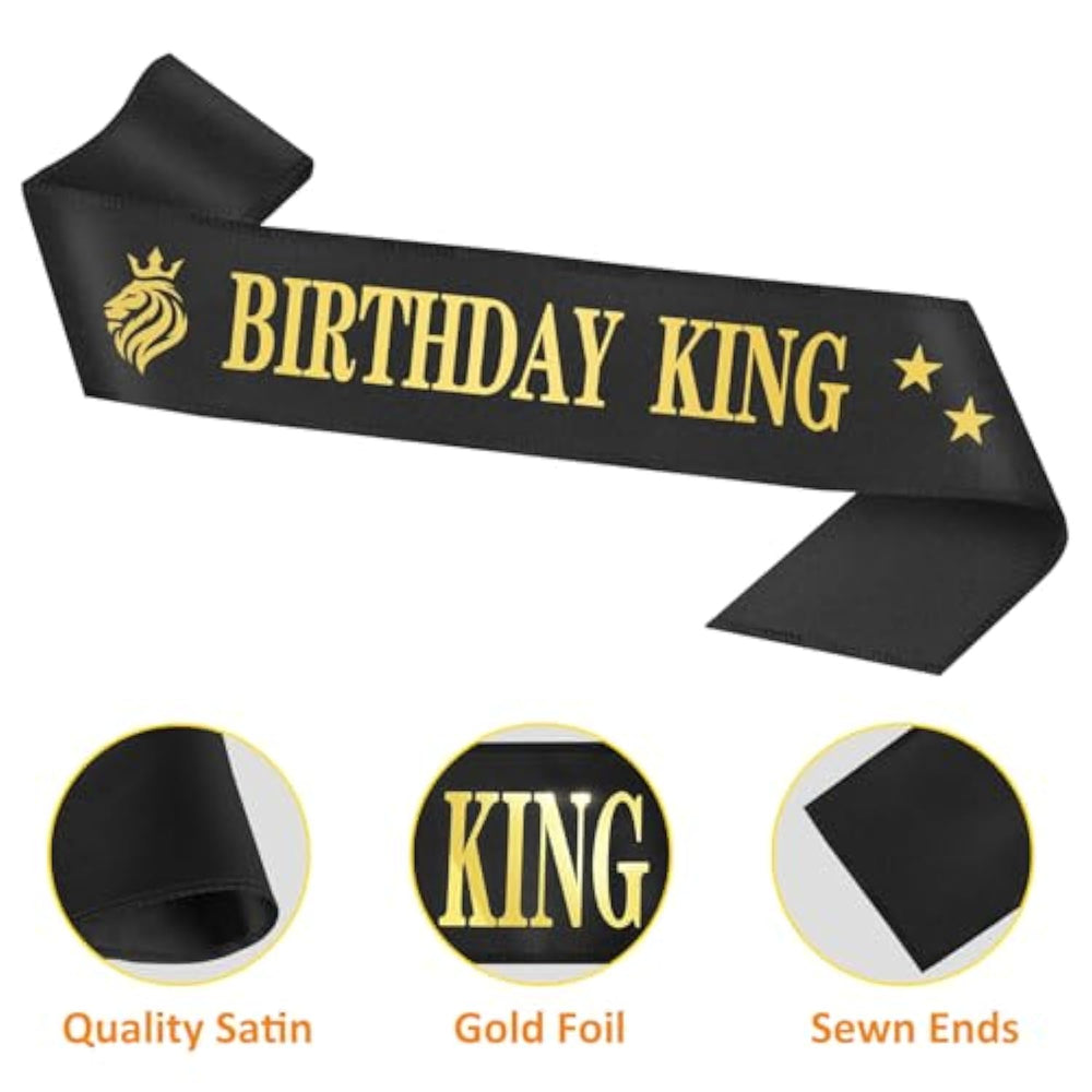 | Birthday Party Decoration For Men: Our Happy Birthday Decorations For Men / Boys Includes: 1X Birthday King Crown, 1 X Birthday King Sash, 1X Shiny Black King Birthday Cake Topper, 6 X Gold Birthday Candles?1 X Best Wishes Greeting Card, 1 X Happy Birthday Gift Box. This Lion King Birthday Party Supplies Will Add More Joyful Atmosphere To Your Birthday Party. | | Advanced Birthday Crown Sash For Men: The Gold Crown For Men / Boys Is Mainly Made Of Alloy And Black Rhinestones, Which Have The Good Gloss And Will Not Fade Easily; The Birthday Sash For Men Is Mainly Made Of Satin, Sewn Ends Without Worry About Falling Apart At The Party. This Mens Birthday Decorations Adopts The Noble Gold And Black Colors, Which Will Give You A Luxurious And Royal Feeling That Makes You Stand Out From The Crowd. | | Classical Birthday Candles Cake Topper: Our Glittery Black King Birthday Cake Topper And Gold Birthday Candles Are Necessary Choice For Your Party Cakes. Bright Glow For Creating Romantic Atmosphere And Adding Much Fun In Birthday Party. Our King Birthday Accessories Is A Nice Combination To Leave You An Unforgettable Memory. | | Perfect Birthday Gifts For Men: Let The Party Crowd Recognize The Identity Of The Birthday King, You Can Surprise Your Boyfriend, Husband, Father Or Male Friend With These King Birthday Decorations For Men. Celebrating Birthday In A Meaningful Way, And Expressing Your Love And Care. | | Suitable Size: Prince Crown Size Approximately 2 Inches In Height, Diameter Size Can Be Adjusted. Birthday King Sash Size?Length Of The 35.4Inch ?Fits Most Men. | |