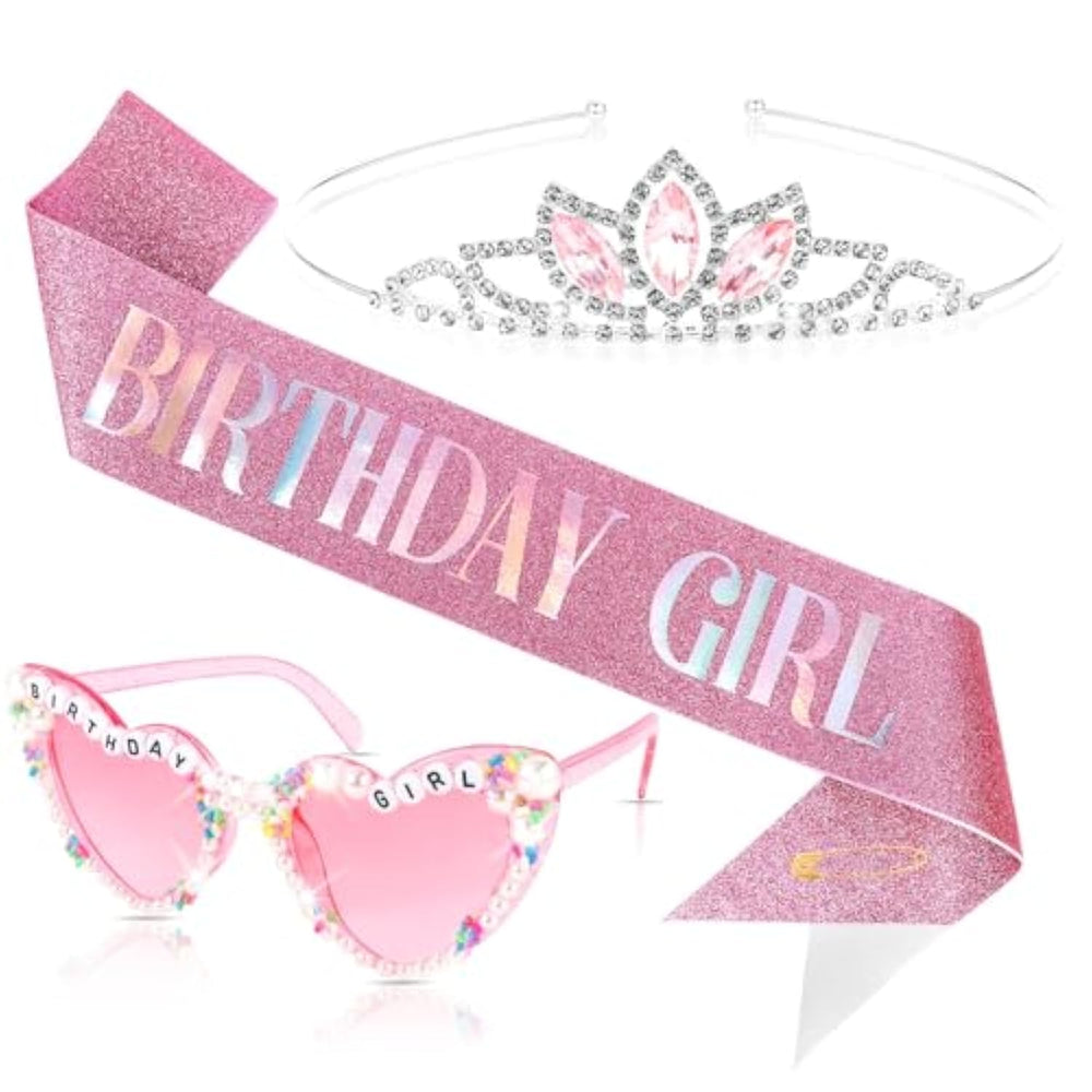 | What You Get: A Pink Birthday Sash For Girls With "Birthday Girl" Letters, A Birthday Tiara Decorated With Glitter Crystals, And A Pink Birthday Galsses With Peach Heart Shape, On Which There Is "Birthday Girl" Letters, And The Birthday Sunglasses Is Decorated With Faux Pearls And Colorful Sprinkles | | High Quality: 1. The Birthday Girl Crown And Sash And Galsses Are Of High Quality. The Birthday Sash Has Shinny Foil, Which Is Charming Under The Light, And The Satin Is Also Glitter, With A Pin To Help You Adjust The Length. 2.Our Birthday Girl Sunglasses Use Hd Lenses Which Is Super Clear And Don'T Cause Visual Fatigue, Sturdy Pc Materials Not Easily Damaged, And Elaborately Selected Rhinestones And Pearls Which Will Glitter Sparkle Beautifully In The Light | | Size: The Birthday Girl Sash Is 70.8" * 3.75", With A Pin To Adjust, The Tiara Is 5 Inches Wide And 1.25 Inches High, And The Birthday Glasses Is 5.9"*2.45", Suitable For Most People'S Face | | Easy To Use: The Birthday Sash For Girls Is Lightweight And Has A Pin To Adjust The Length To Fit For Different People'S Height, And The Birthday Sunglasses Is Lightweight; The Tiara Is Smooth, No Hurting | | A Wonderful Gift Idea: This Birthday Tiara And Sash And Sunglasses Set Is A Perfect Gift For Your Families, Friends Or Lover For Brithday, Also For Yourself, Making The Birthday Star Shinny Among The Crowd | |