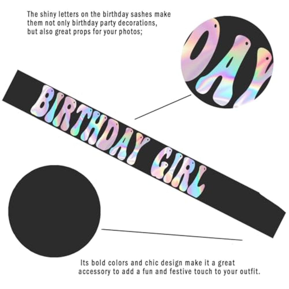 | Hand Wash Only | | Birthday Girl Sash: Our Black Birthday Sash Has Iridescent Text ''Birthday Girl " In Gorgeous Fun Text Style. You Will Be The Star Of The Birthday Party With A Unique Sash And It Makes An Ideal Party Prop For The Birthday Photos! The Perfect Accessory For Your Party Outfit | | Perfect Gift For Birthday: Enjoy A Memorable Birthday With This Trendy Sash. You Can Upgrade Your Sweet 16 Party, 18Th Birthday Party, 21St Celebration, Dirty 30Th Birthday Or Any Other Birthday Parties. Also Makes A Thoughtful Present For A Beloved Family Or Friend | | Premium Quality: The Stylish Birthday Sash Made Of Premium Quality Satin Sash With Glitter Lettering. Unlike Other Poorly Made Sashes, This Sash Does Not Tear Or Wrinkle Easily. No Need To Worry About Letters Peeling Off | | Suitable Size: The Birthday Sash Is 31.5 Inches Length And 3.74 Inches Width. A Safety Pin Is Included Inside, Which Can Be Used To Fix The Sash, Our Sash Is Suitable For Most People, You Can Use It With Confidence | | After-Sales Service: Please Note That If The Sash Arrives Slightly Wrinkled From Transit - It'S Best To Iron On The Back Of The Sash To Prevent The Foil From Melting! Wish You Or Your Family And Friends Have A Nice Party | |