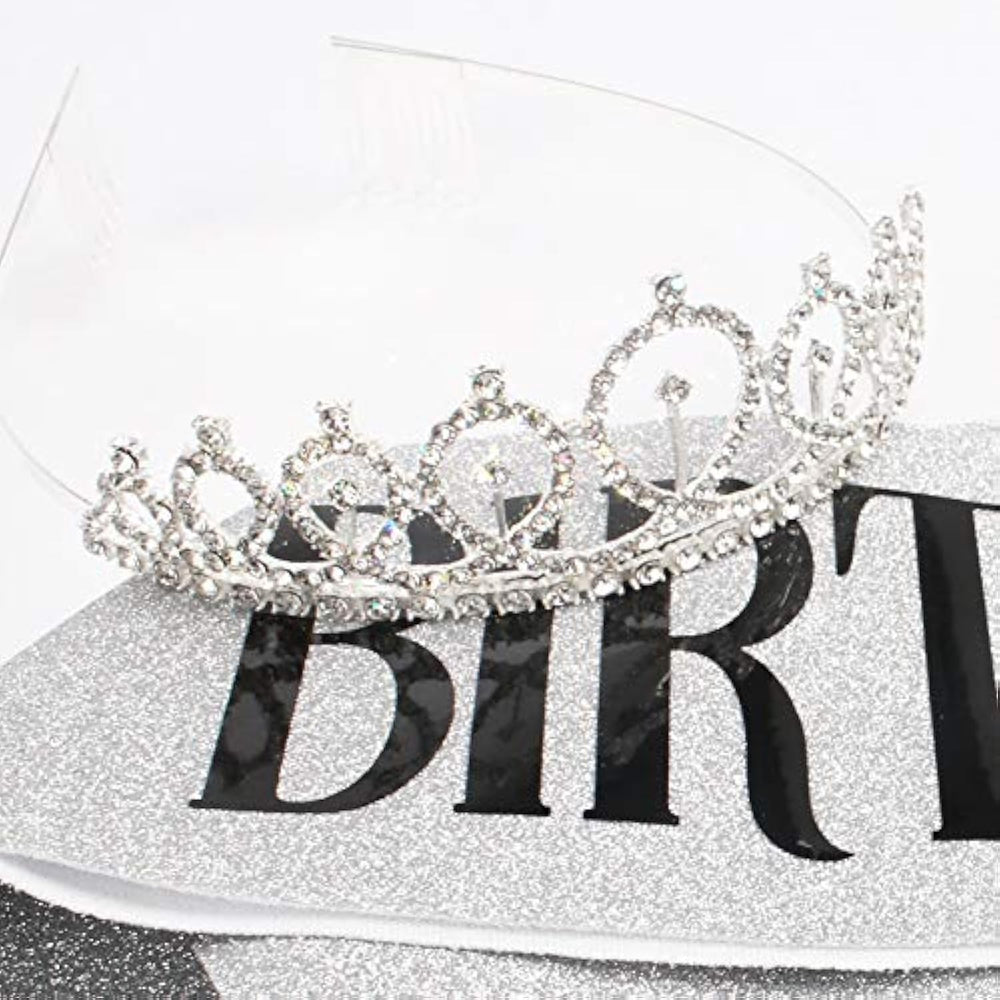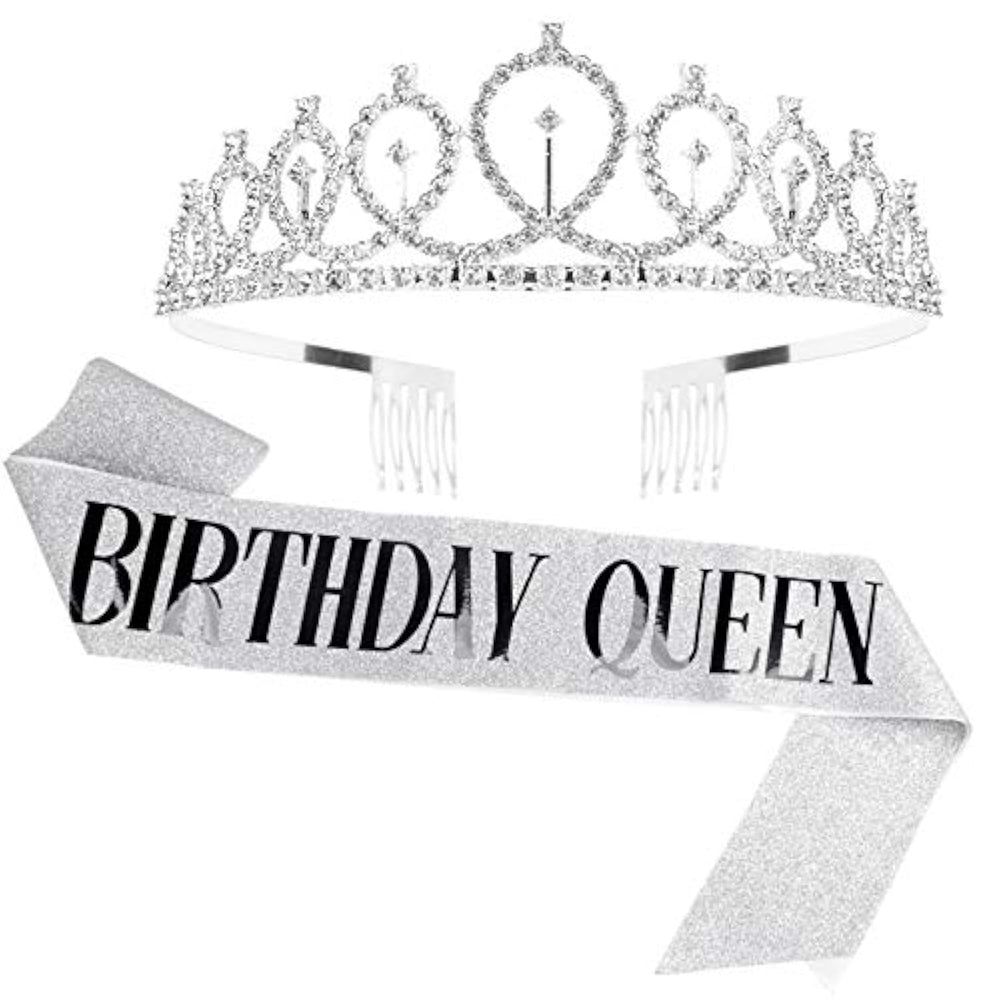 | Silver "Birthday Queen" Sash + Rhinestone Tiara Gifts Set. | | Sparkly Sash: Made Of Soft Fabric Hot Pressed With Stamping Glitter. Premium Quality And No Coming Off Glitter. Black “Birthday Queen” Letters Make The Sash Look Shiny And Elegant. | | Delicate Rhinestone Tiara: Made Of Sturdy Hard Alloy, Encrusted With Dazzling Rhinestones. Delicate Designed For Birthday Queen Specially. Perfect Party Favors For Her Cherish One-Year-Once Birthday. Makes The Woman The Most Special One In Crowd. | | One Size Fits All: With 61” Length, Our Birthday Sash Fits All Type Body Figures. It Can Be Easily Adjusted By A Clip. The Tiara Comes With Comb Design, They Are Suitable For All Kinds Of Hair And Stay In Place. | | Perfect After-Sales Service: Our Products Are In Good Quality. We Will Be Responsible For Them. If You Have Any Doubts About The Products, Please Fell Free To