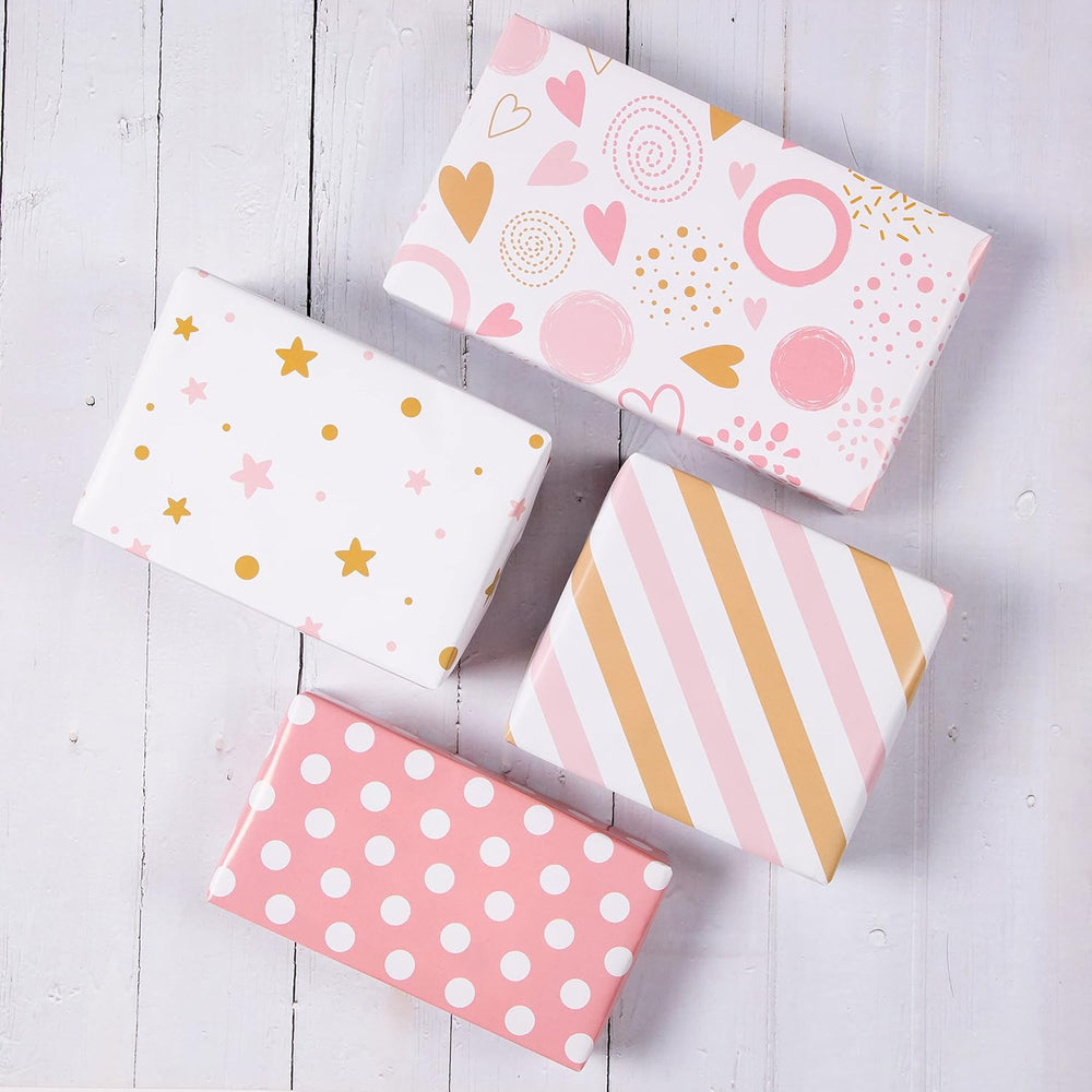 | Birthday Wrapping Paper: 12 Sheets Of Girl Gift Wrapping Paper Each Sheet Measures 20 X 29 Inches And Can Wrap At Least 12 Small To Medium Sized Gifts For Your Gift-Wrapping Needs (Not Suitable For Very Large Gift Boxes). Pink And Gold Design:Birthday Wrapping Paper Contains 4 Lovely Patterns Of Pink Hearts, Stars, Lines, And Polka Dots To Make Your Gift More Beautiful. All Occasions: Perfect For Birthday, Valentine'S Day, Mother'S Day, Christmas, Graduation, Party, Holiday, New Year, Our Wrapping Paper Adds Vibrancy And Fun To Your Gifts And Is Also Great For Craft Projects. Not A Roll ! : Each Sheet Is Pre-Cut And Fold Twice, Easier To Use And Store Than Traditional Paper Rolls. The Paper Will Have Wrinkles And Creases, But This Will Not Affect Its Packaging And Will Still Add Beauty To Your Gift Wrap. Premium Papers: Created With High Quality Paper Materials, Thick And Durable, Eco Friendly And Recyclable, Not Easy To Tear Or Break. Professional Printing In Beautiful Colors Makes The Luster Shine! Happy Shopping: Pictures And The Real Thing Because Of The Different Shooting Will Have Color Differences, Thank You For Your Understanding And Support, Wish You Happy Shopping!