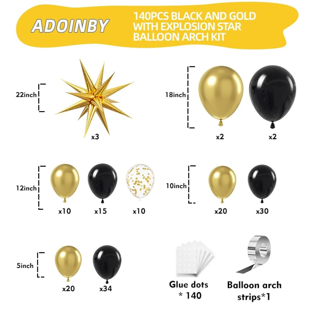 This 140-piece Black and Gold Balloon Garland Kit includes a mix of balloon sizes—22" gold star balloons, 18", 12", 10", and 5" black and metallic gold balloons, plus gold confetti balloons—along with a 16ft garland strip and 140 glue dots for easy assembly. Made from high-quality latex, these balloons are durable, stretch well, and can be filled with air or helium. Perfect for birthdays, anniversaries, weddings, baby showers, and holiday celebrations, this kit adds a glamorous touch to any event and is simple to set up for stunning DIY decor.
