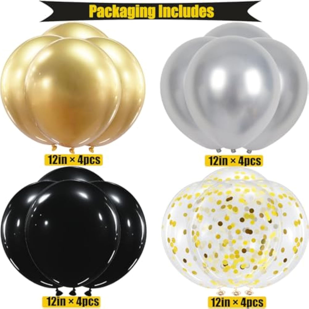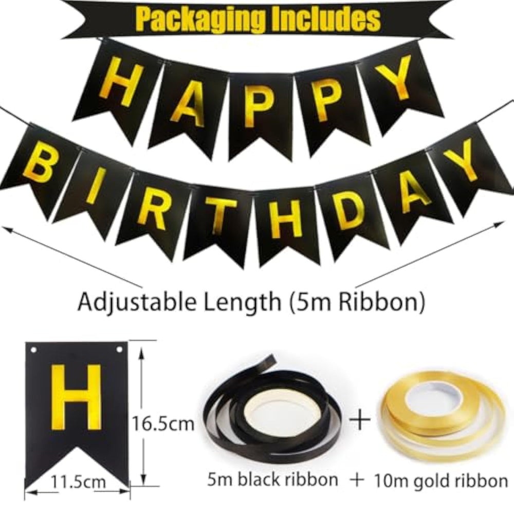 This black birthday decoration set includes a "Happy Birthday" banner, 16 colorful 12-inch balloons (black, gold confetti, gold metallic, and silver metallic), and 2 rolls of ribbon. Perfect for any birthday celebration, it’s suitable for men, women, and all ages. The banner is made from high-quality, eco-friendly paper, and the balloons are durable, non-toxic latex that can be inflated with air or helium without the worry of popping. Easy to assemble, simply use the ribbon to hang the banner and create a festive atmosphere for an unforgettable party.