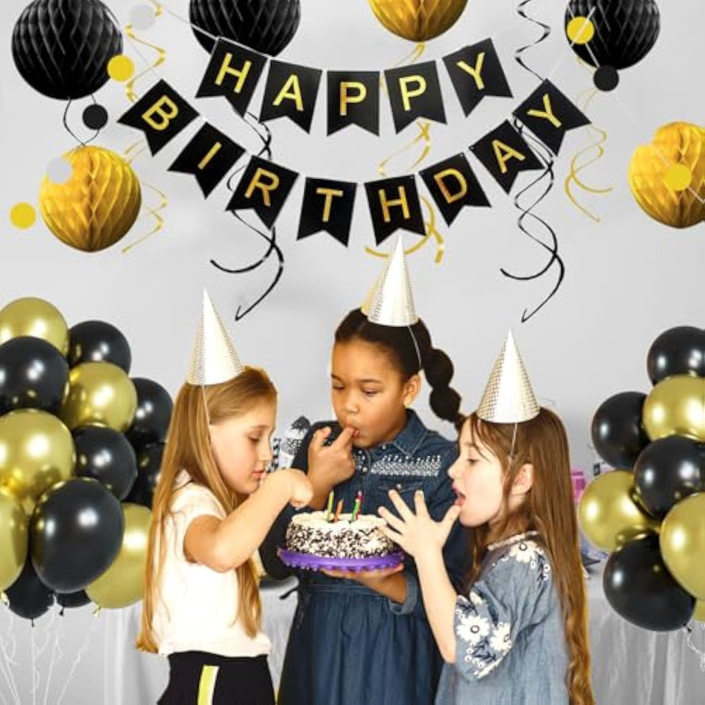 | ?Beautiful Party Set?Black And Gold Birthday Decorations Has Everything You Need To Decorate The Birthday Party. The Black And Gold Theme Birthday Supplies Set Include 6Pcs Honeycomb Balls + Happy Birthday Banner + 13.2Ft Long Circle Garland + 6Pcs Swirl Streamers + 20Pcs Black And Gold Balloons | | ?Durable And Sturdy?The Happy Birthday Banner Set Are Made Of High Quality Eco-Friendly Paper, Safe And Non-Toxic. All These Happy Party Decorations Are Easy To Assemble. Just Enjoy The Fun Of Diy With Your Kids. | | ?Black And Gold Combination?Birthday Decorations For Men Consists Of Multiple Bright Colors. Honeycomb Balls Is Black And Gold.Happy Birthday Banner, Balloons And Circle Garland Are Black And Gold. Hanging Swirls Are Black And Gold. | | ?Perfect For Birthday? Happy Birthday Decorations Are Very Perfect For Birthday Party, Baby Shower And Other Celebrations Party Decorations. Just Enjoy Happy Of The Rainbow Birthday Party With Your Family Or Friend. | | ?Our Service?We Are Very Confident With The Quality Of Our Black And Gold Birthday Decoration. If There Are Any Quality Issues, We Will Be At Your Service Until You Are Satisfied. Purchase With Confidence. | |