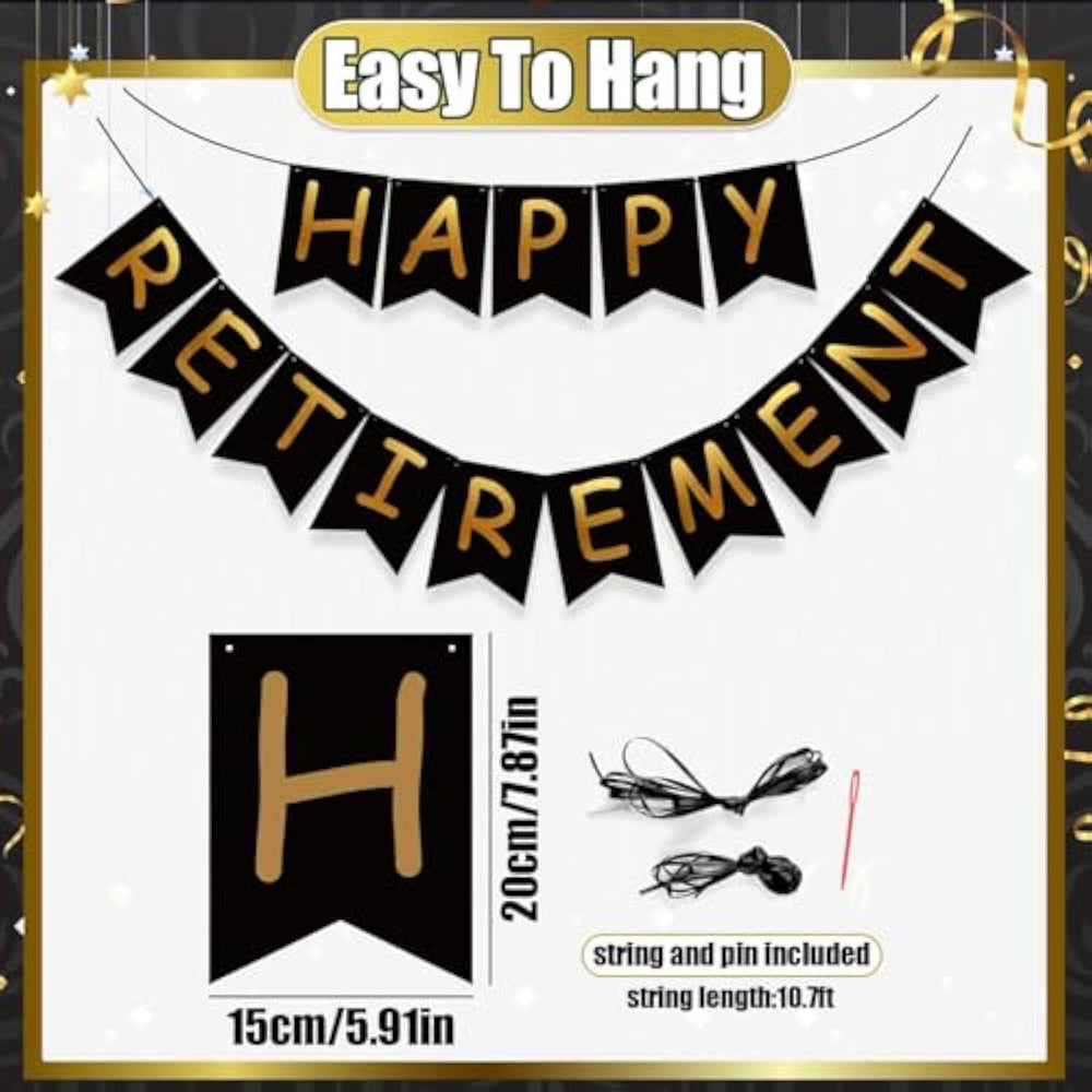 Celebrate retirement in style with this black and gold decoration kit, featuring a “Happy Retirement” banner (self-assembly required with included string and pins) and 12 matching hanging swirls. Designed by "Better Now," these festive decorations add a touch of shine and elegance to any retirement celebration. The high-quality paper banner features large letters (approx. 4.8" x 6"), and the round cards measure 7" in diameter. Easy to assemble and reuse, simply thread the letters and carefully separate the swirls along perforated lines.