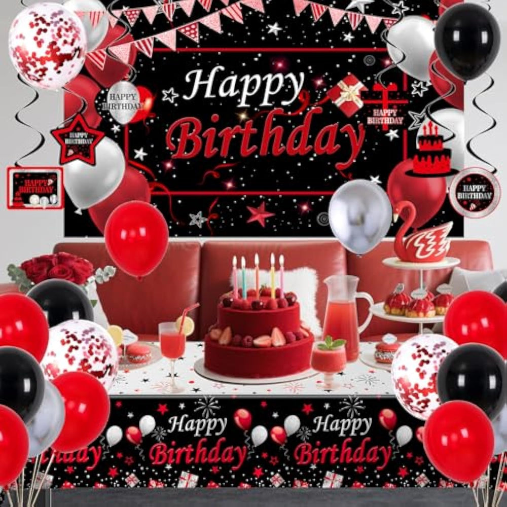 | Red Birthday Decorations Kit: Contains 10" Latex Balloon 30Pcs ( Red Balloons 15Pcs, Black Balloons 10Pcs, Silver Balloons 5Pcs ), 12" Red Confetti Balloons 5Pcs, Happy Birthday Backdrop Cloth 59.1 X 39.4In (150X100Cm), Happy Birthday Banner 1 Set, Happy Birthday Table Cover 1Pcs, Hanging Swirls And Pendant 6Pcs, Sticky Dots, Strip And Ribbon. | | Easy To Assemble: Easy To Blow Up The Latex Balloons, Make It A Silver Red And Black Balloon Arch Garland Kit Or Tie Them With Ribbon. Easy To Put The Banner Letters Together With The Provided Ribbon, And Connect The Red Black Hanging Swirls And Pendants, And Hang Them Up To Wall, Door, Window, Tree, Anywhere You Like. The Table Cloth Is Waterproof And Disposable, With Vibrant Colors And Pattern Printing On It. The Quality Makes Your Party More Gorgeous. | | Happy Birthday Backdrop: Made From Thick Polyester Fabrics, Seamless, Sturdy, Lightweight, No-Fading, And Reusable. Vibrant Printing Of All Birthday Elements, Match With Your Theme Party Need. There Are 4 Ring Holes In The Birthday Backdrop Cloth Corners, You Can Easily Hang It Up To Anywhere To Make Your Party Looks Great. | | Party Photography Background: Red And Black Happy Birthday Decorations For Women Men Boys Girls 10Th 13Th 16Th 18Th 20Th 21St 25Th 30Th 35Th 40Th 50Th 60Th Etc., Creates A Joyful And Surprising Birthday Party. It'S Suitable For Party Photography Backdrops To Leave Precious Photos. Enjoy The Party With Your Families Friends, Or Anyone. | | High Quality Balloons: Thick And Strong Latex Balloons Are Odorless, Non-Toxic And Sturdy, Make It Safe To Use. 5Pcs Confetti Balloons Available, When Vibe Reaching The Peak, Poke Confetti Balloons To Burst, The Confetti Will Come Out, Fly And Celebrate This Vital And Memorable Day. | |