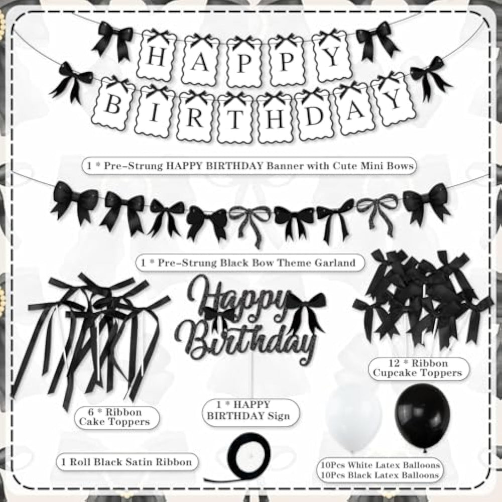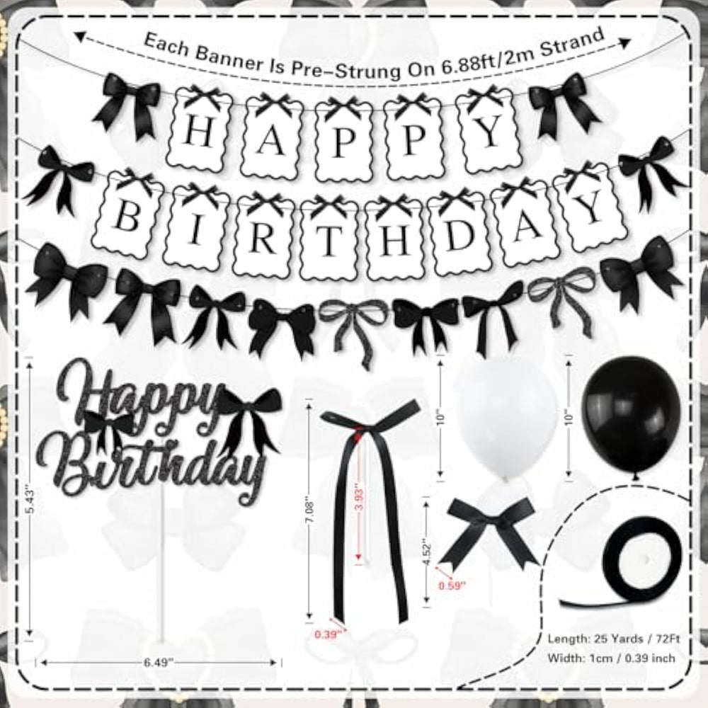 | Black Bow Birthday Decorations: Add A Touch Of Delicate Charm To Your Space With This Fancy Black Bow Birthday Decorations Kit! The Set Combination Of Bow Happy Birthday Banner, Bow Theme Garland, Ribbon Bow Cake Toppers, Ribbon Bow Cupcake Toppers, Black White Balloons Set, Adding Black Satin Ribbon, That Will Sure To Bring A Touch Of Elegant And Sweetness To Your Party | | You Will Get: 1 * Pre-Strung Happy Birthday Banner, 1 * Pre-Strung Black Bow Garland, 1 * Glittering Happy Birthday Cake Sign, 6Pcs Ribbon Cupcake Toppers, 12Pcs Rribbon Bow Cupcake Toppers, 1 Roll Black Satin Ribbon?You Can Diy It As Bow Decor, 20Pcs White Black Latex Balloons | | Premium Quality: Handcraft With Exquisite Detail; Banner Crafted From High-Quality Cardstork Paper With Ribbon Bows Above, And Cake Topper Crafted From High-Quality Satin Ribbon Material, Balloons Are Made Of Natural Latex, With Thicker Latex Quality | | Special Design Easy Decoration: All Set Includes Bow Themed Elements; The Set Is Specially Designed With A Variety Bow Elements That Will Definitely Add Extra Festive Atmosphere To Your Party; The Banner Comes Pre-Strung And Already Assembled, Super Easy To Decorate | | Versatile Decoration: Perfect Addition To Your Girls Bow Birthday Party, Bow Party Decor, Baby Shower, Bridal Shower, Wedding, Bachelorette Party, Or Add A Touch Of Sophistication And Charm To Any Space | |
