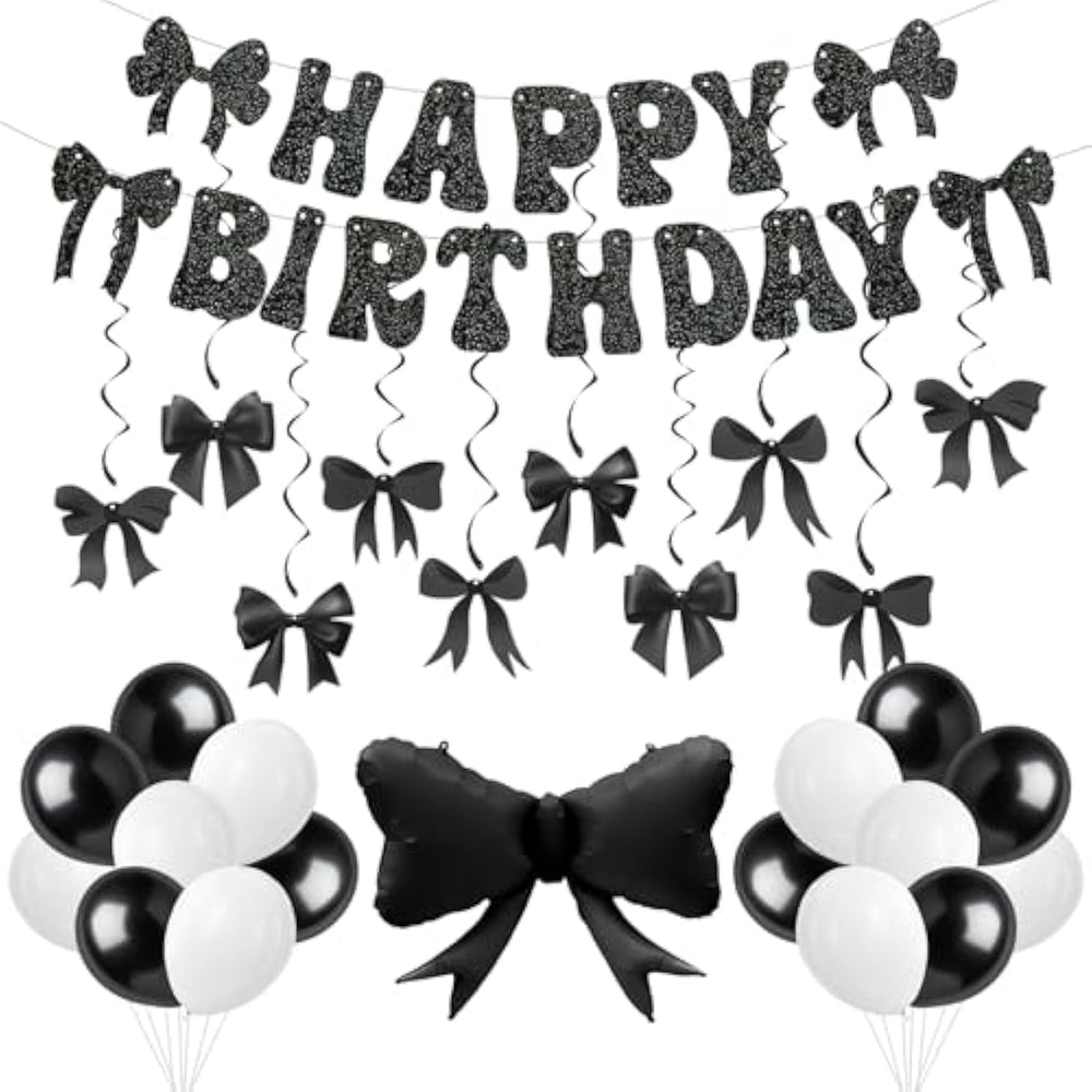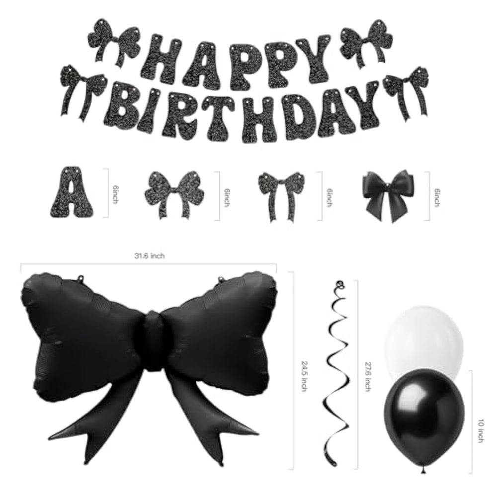 | Black Bow Party Decorations Package: Contains 1 Set "Happy Birthday" Banner,20Pc 10-Inch Latex Balloons, 1Pcs Large Foil Black Bow Balloon,10 Pcs Black Bow Hanging Swirls,1Pc 8Cm Straw,3Pc 10M Ribbon And 1Pc Glue | | High Quality: All Items In This Kit Are Crafted With Meticulous Attention To Detail Using High-Quality Materials. The Banner And Hanging Swirls Are Made From Thick, Durable Cardstock Paper, While The Latex Balloons Are Crafted From Eco-Friendly Natural Rubber, Offering A Premium And Long-Lasting Finish. | | Versatile Use: While This Set Is Ideal For A Girls’ Birthday Party, Its Sophisticated Design Also Makes It Perfect For Other Celebrations, Such As Baby Showers, Bridal Showers, Weddings, Or Even Bachelorette Parties. Add A Touch Of Charm And Style To Any Event With This Versatile Kit. | | Easy Setup: Setting Up The "Happy Birthday" Banner Is Simple—Just String It Onto The Included Rope And Hang It Wherever You Like, From Balconies To Ceilings. | |